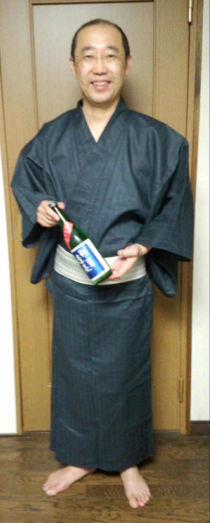 紺色の浴衣に、白の博多帯、そして日本酒は、『残草蓬莱・青ラベル14度原酒!』