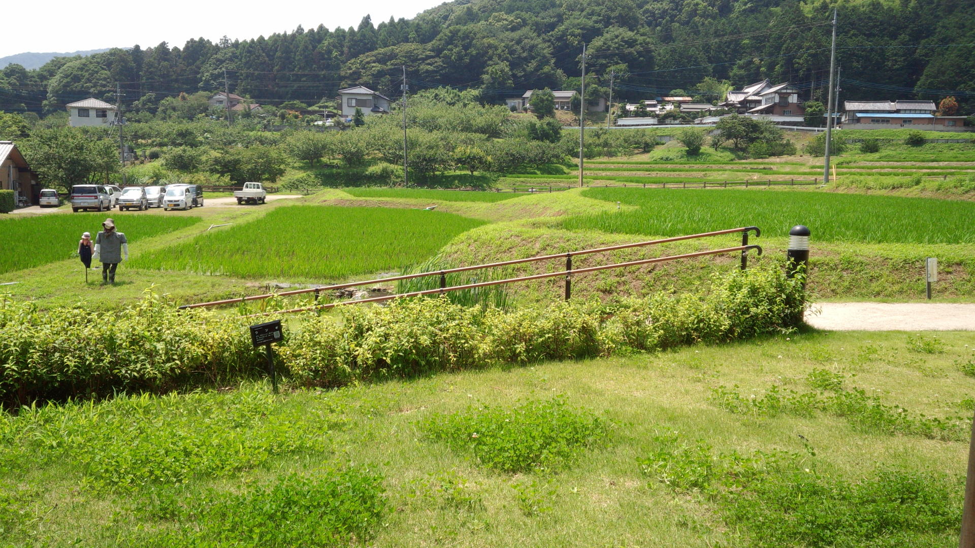 里山の風景がそのまま残っおり、周囲は田んぼに囲まれ、近くには小川も流れています。