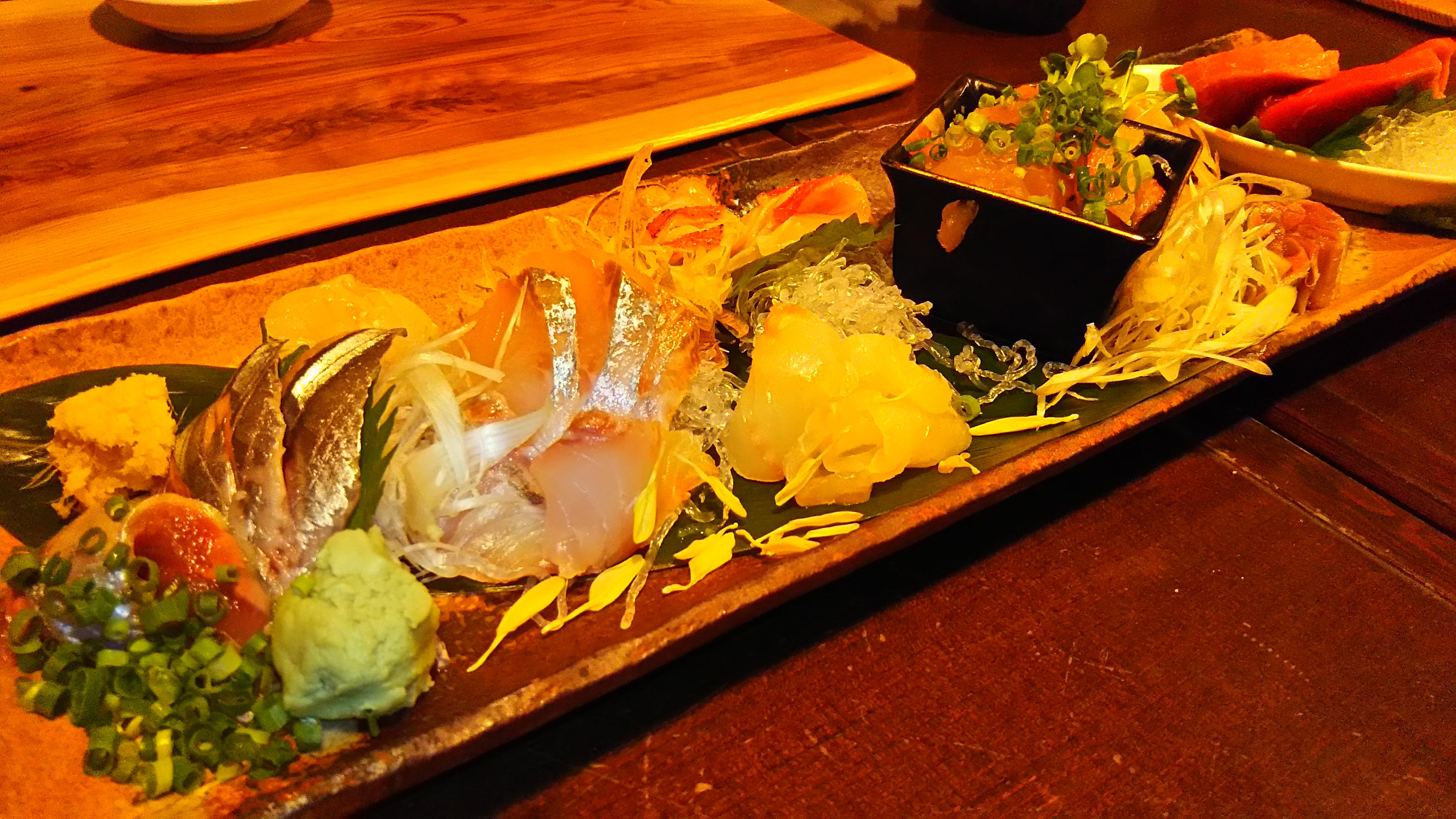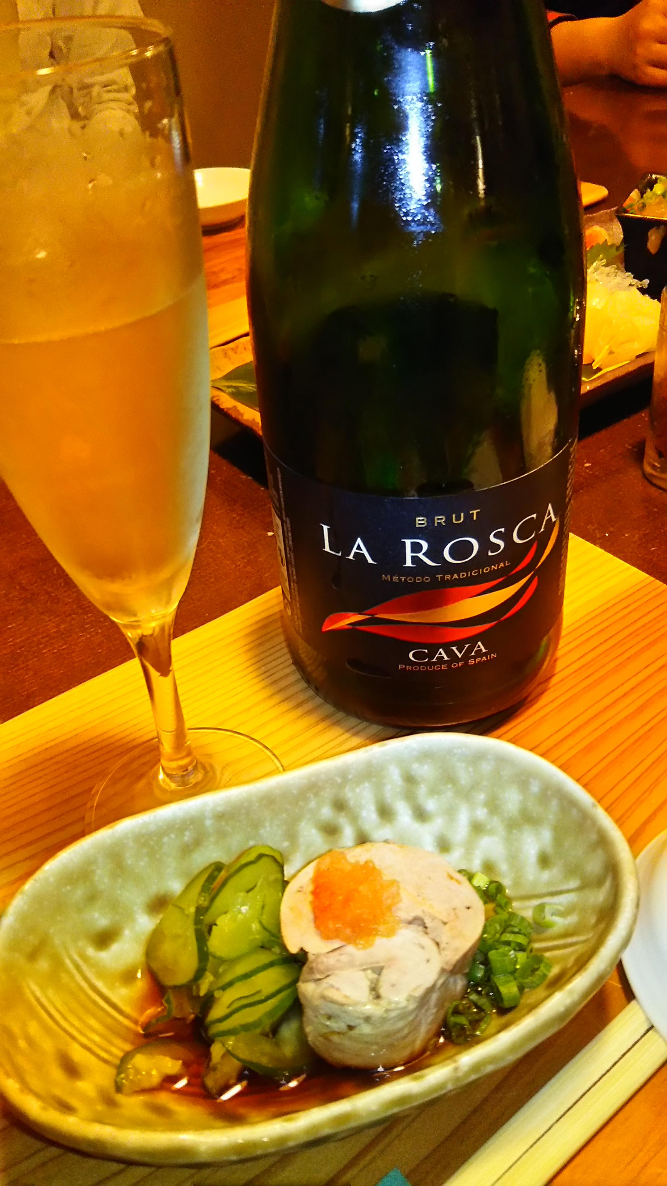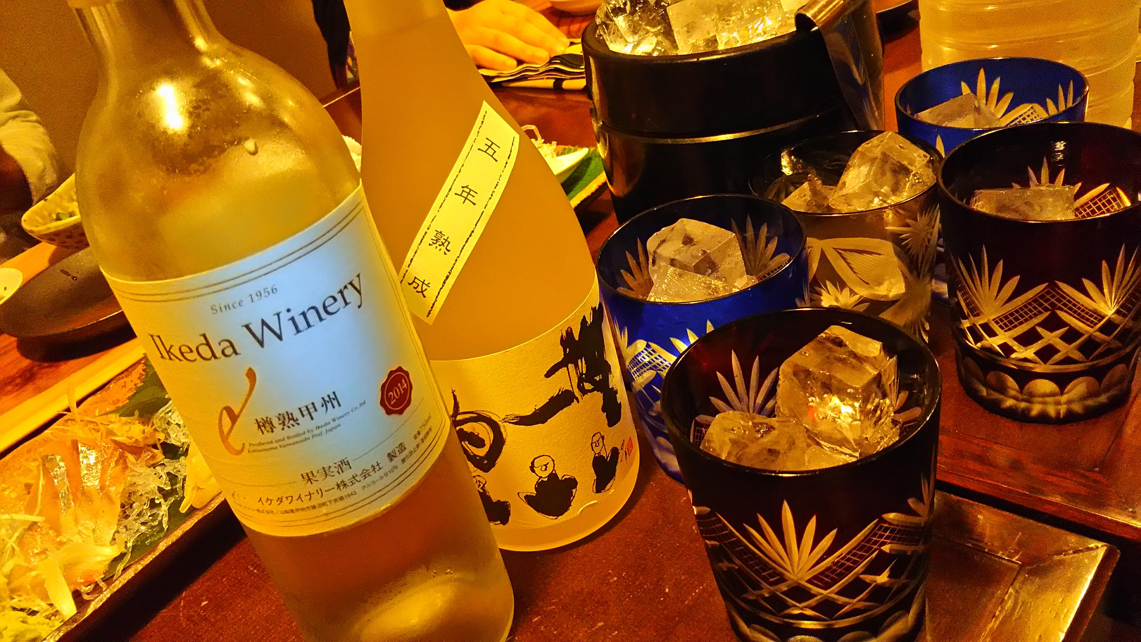 ウエルカムドリンクとして『琥珀のエビス』をタンブラーで頂き、喉を湿らせた後にスペインの辛口スパークリングワイン『ラ・ロスカ』で乾杯しました。刺身系の登場に合わせて辛口の白ワイン『イケダ樽熟甲州』をグラスに注ぎいれ、同時に違う味わいも試したいので樽熟成の麦焼酎『無一物』の薄めの水割りを作っておきます。その後焼き物や揚げ物も運ばれてきて来たので、焼酎のさっぱり感が口の中をリセットしてくれました。