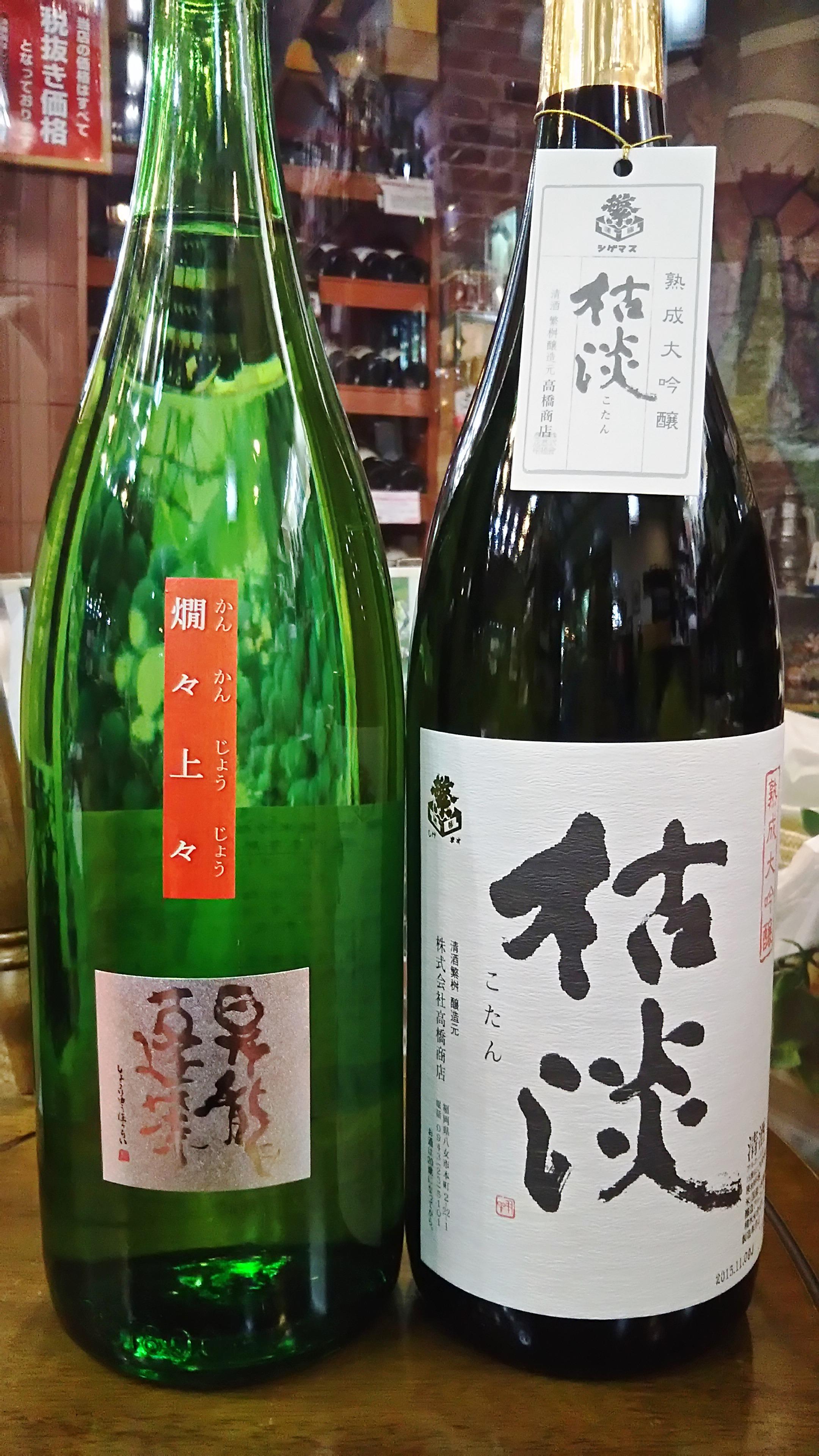 こんな話を蔵元さんとの会話の中でしていたら、何と!面白いお酒を送ってきてくれました!その名も『燗々上々(カンカンジョウジョウ)』といって、お燗をするとお酒の持つ旨味がドンドン良くなってくるという代物だそうで、冷ではなくて、お燗して飲んでくださいと言っていました。他にも、温めることで力強い旨味と深みのある香りが顔を出す熟成大吟醸の『枯淡(コタン)』というお酒も入荷しました。