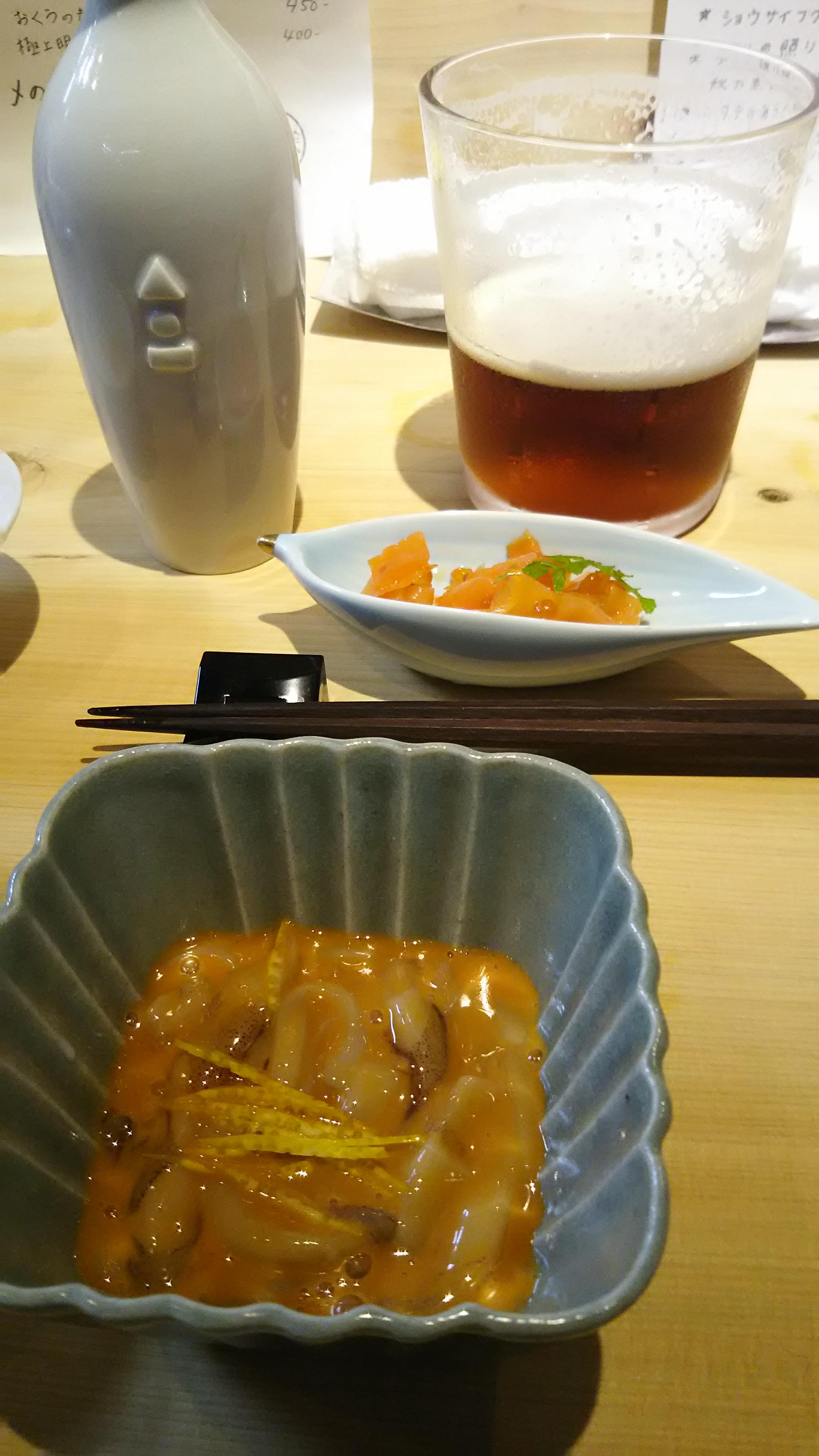 おでんのお出汁の旨味とお酒の旨味とが絶妙に絡み合い、しかも体の芯からじっくりと暖まって来る感覚がとっても心地いいんです。身体が暖まりリラックスできたところで出てきたのが、鮮度抜群の自家製塩辛です。新鮮なイカならではのワタの甘みと絶妙の塩加減で、これまた酒が進んでしまいました。