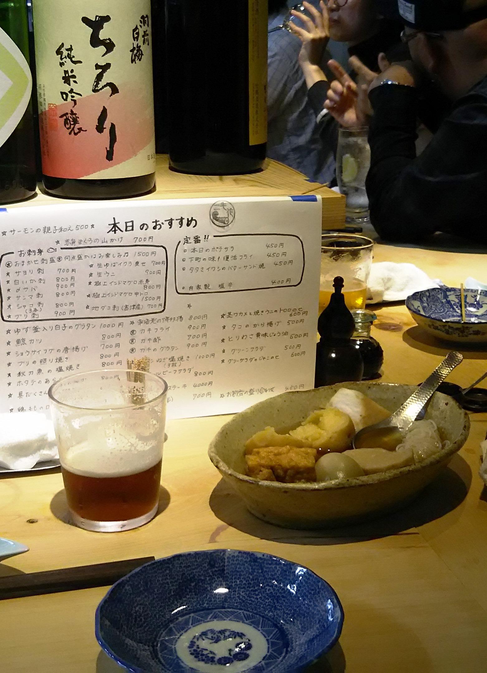 入店すると、早速、上品なお出汁をたっぷりと吸ったおでんが目の前に運ばれ、次から次へと酒飲みの心を刺激するお料理が並べられていきました。こうなってしまったら、もう日本酒を呑まずにはいられないのが酒飲みの性というやつで、おでんに合うお酒を色々と物色することにしたんです。ビール、ワイン、日本酒、など、どれも心惹かれる銘柄ばかりが目に飛び込んできます。
