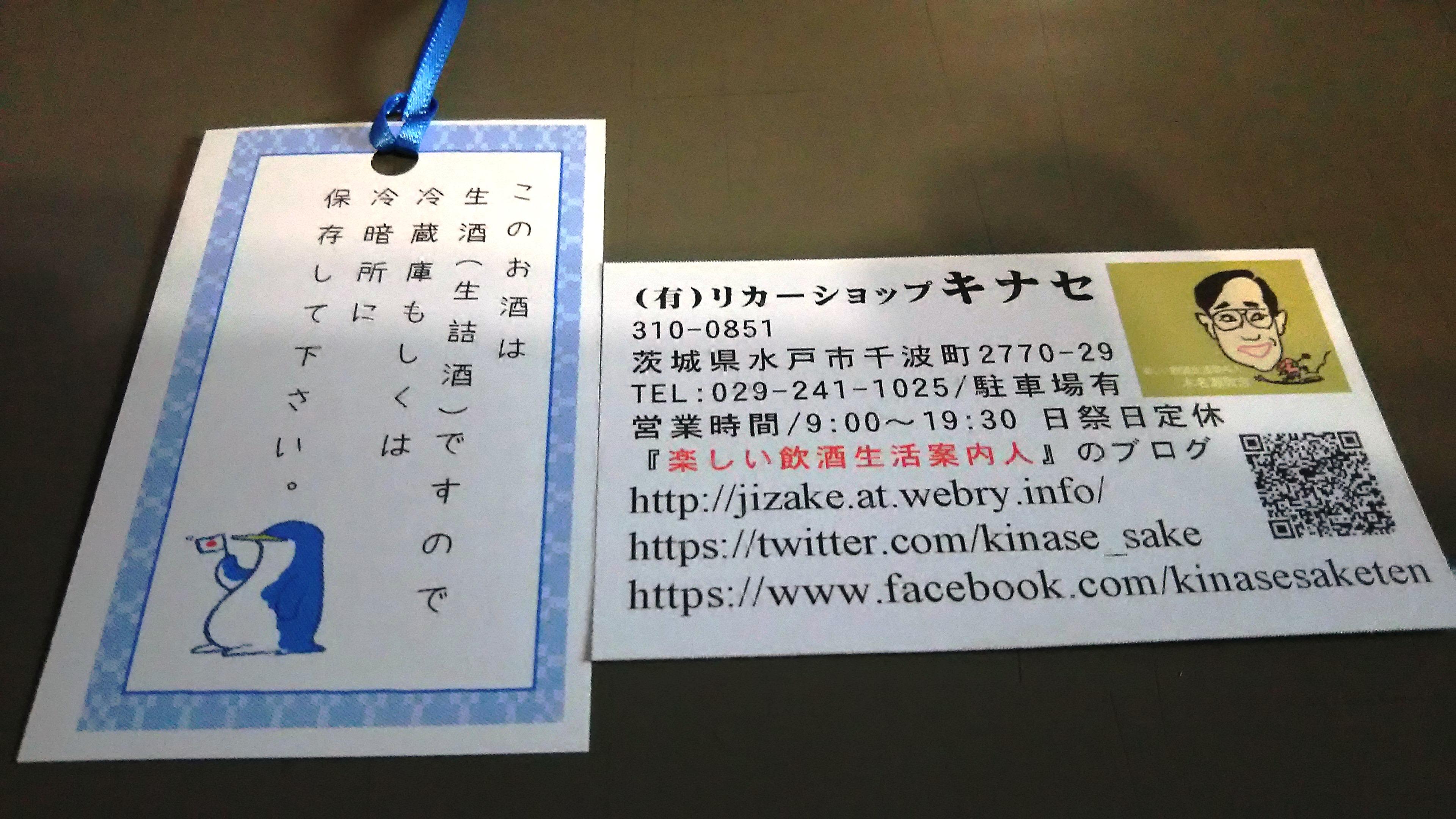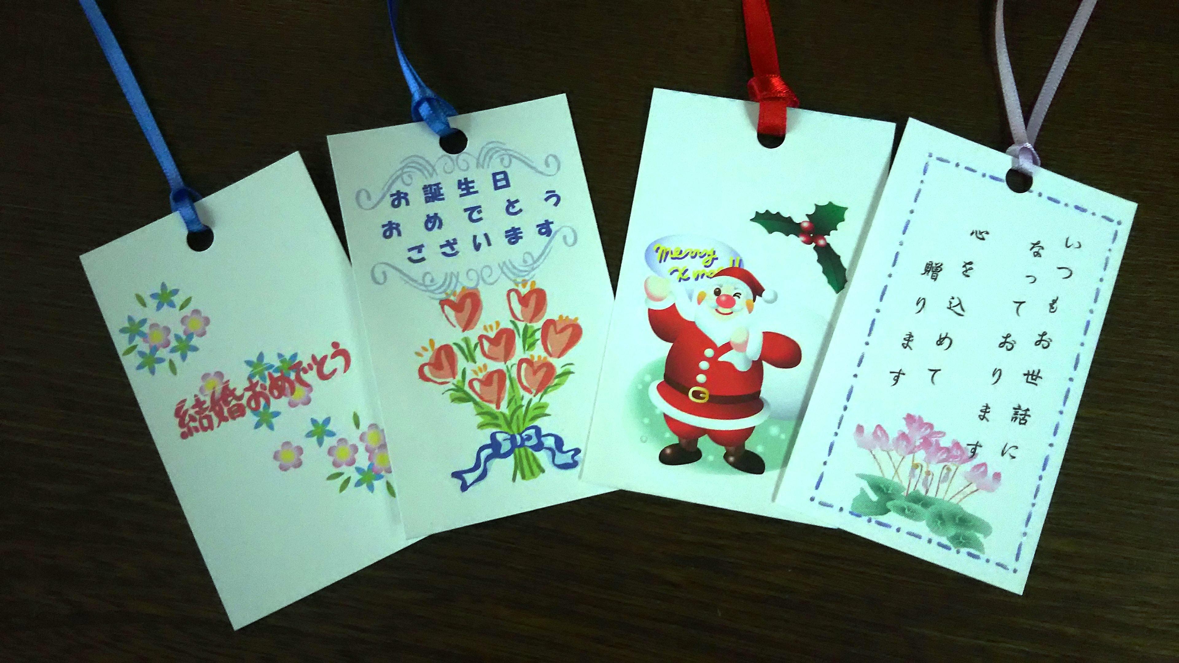 冷蔵管理が必要な物には、その旨を記載したカードをお酒の首に下げるようにしています。また、商品に不具合があった時の為にご希望の方にはショップカードも付けさせていただいております。他にも、今の時期でしたら、『クリスマスバージョン』や『お世話になりました』などのメッセージカードをご用意しています。