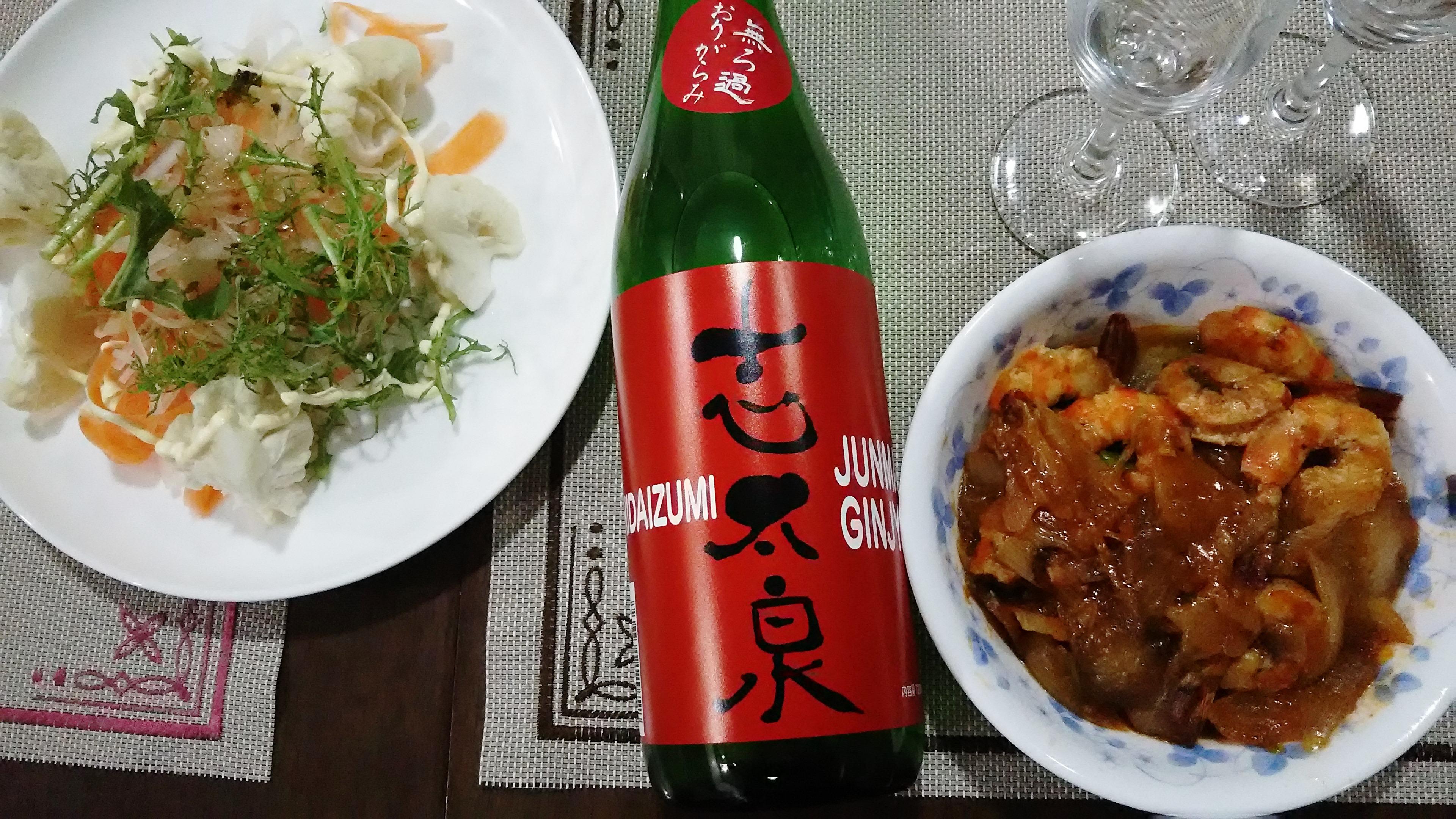 この日の料理は、これまた山海の旬の恵みを頂きました。鹿児島から送られてきたクルマエビを使ったエビチリと友人が作っている無農薬栽培の採れたて葉物野菜たちです。野菜のほのかな甘みが酒の香りに良くマッチします。エビのコクとちょいピリ辛の味わいを、ドライでキレのある酒がきれいに流してくれます。また、少しお酒の温度が上がった頃には、濃醇な旨味も顔をだしてきて、いつもよりも杯が進んでしまいました!