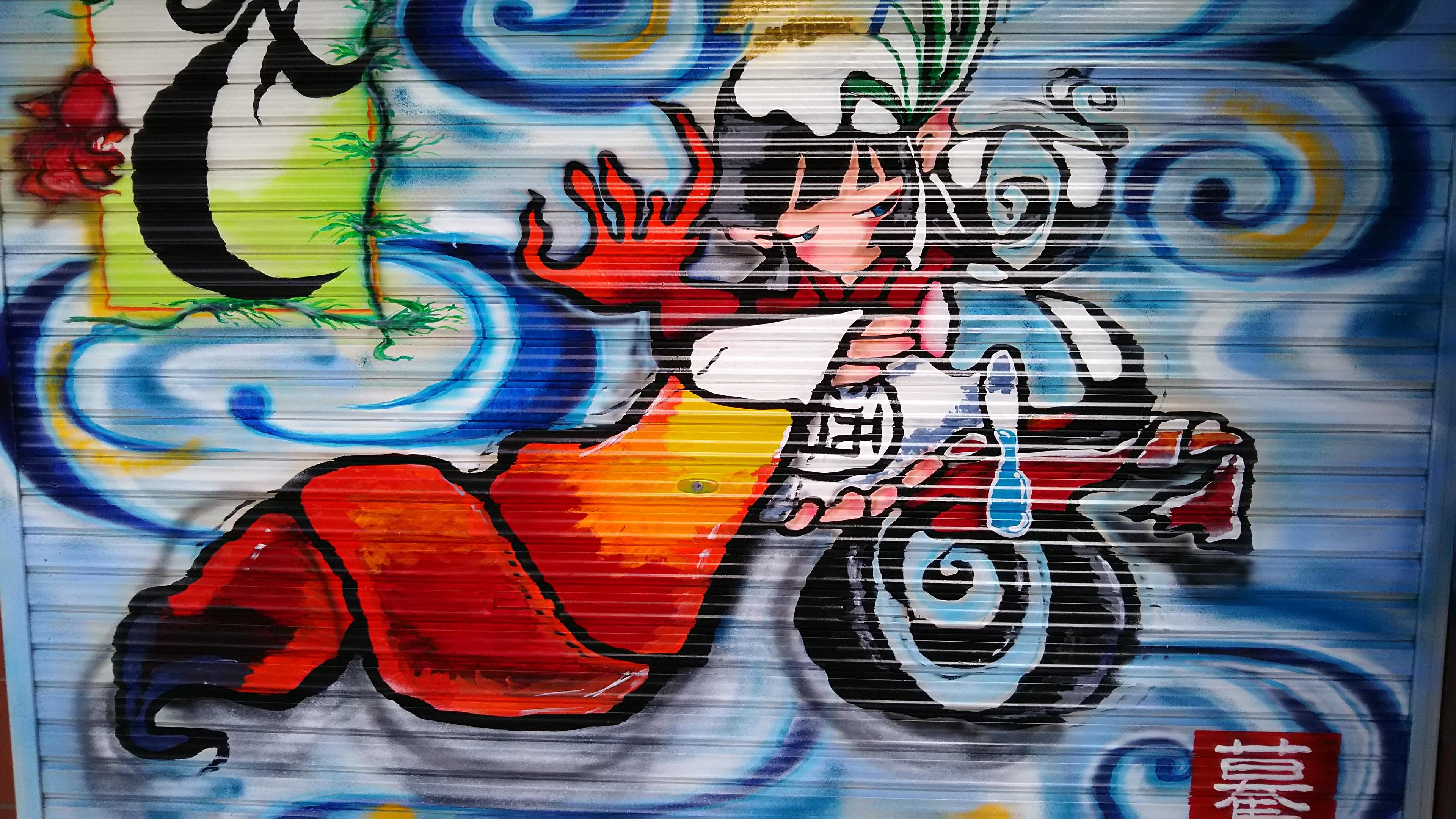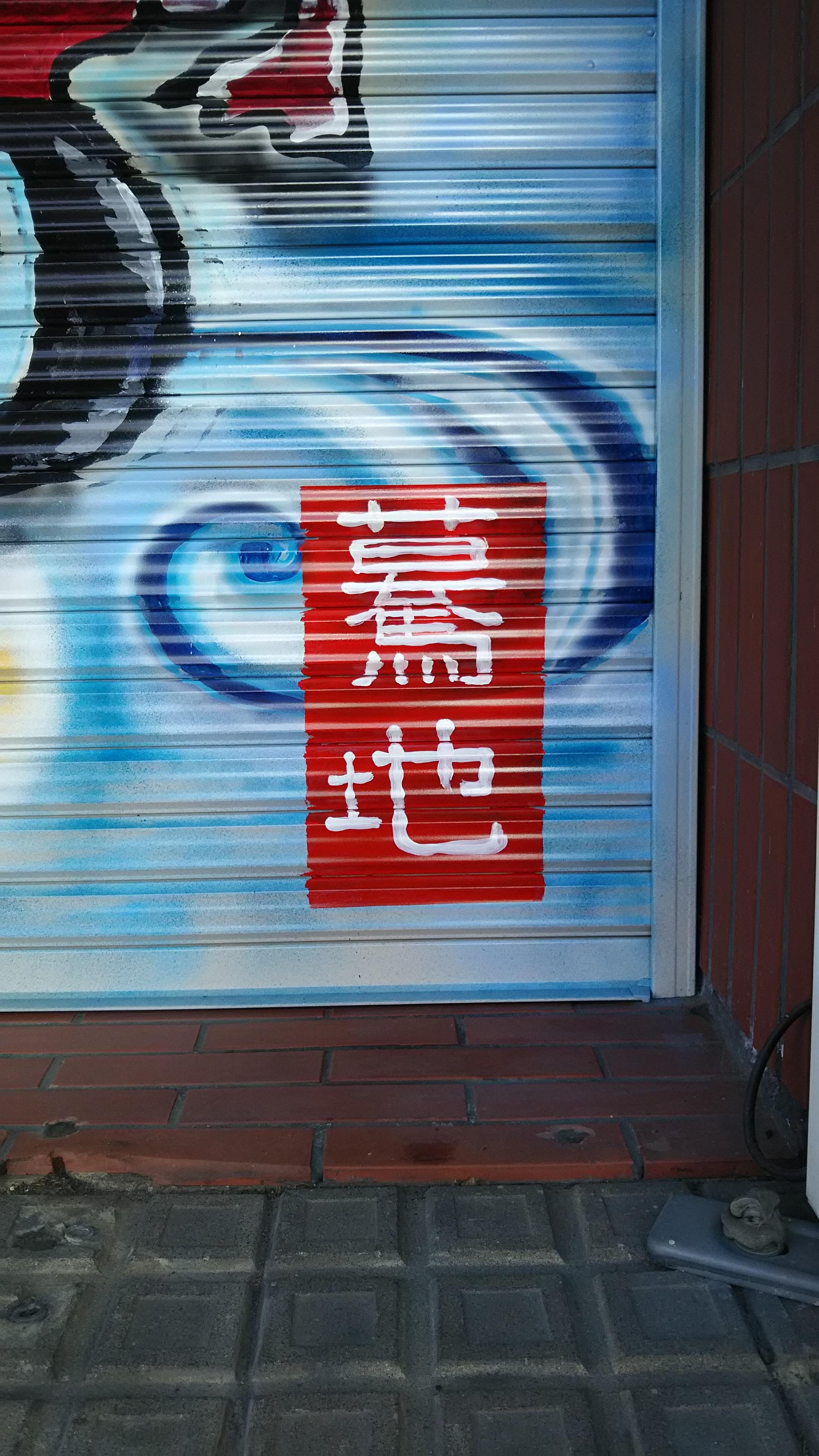 その【ましぐら】というユニット名を持つお二人に今回当店のシャッターアートを作成して頂いたのですが、その名の通り、当店&酒に対する熱い思いを込めた素晴らしい絵を描いてくださいました。