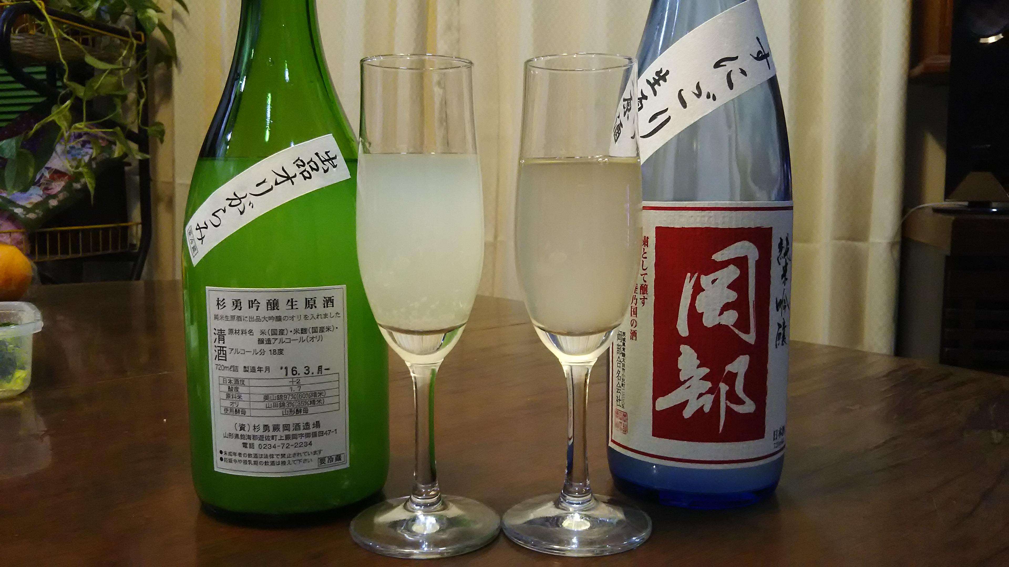これから益々旨味と香りが出てきて、本来の素晴らしい味わいを醸し出してくれると思いますので、飲み進める際には一升瓶なら最低でも一週間くらいかけてじっくりと味わっていただきたいと思います。また、この二つを同時に飲む時は、『岡部・純米吟醸うすにごり』を先に飲んでから『杉勇・出品おりがらみ』を飲んでいただければ、より一層二つの個性を感じやすくなることでしょう!