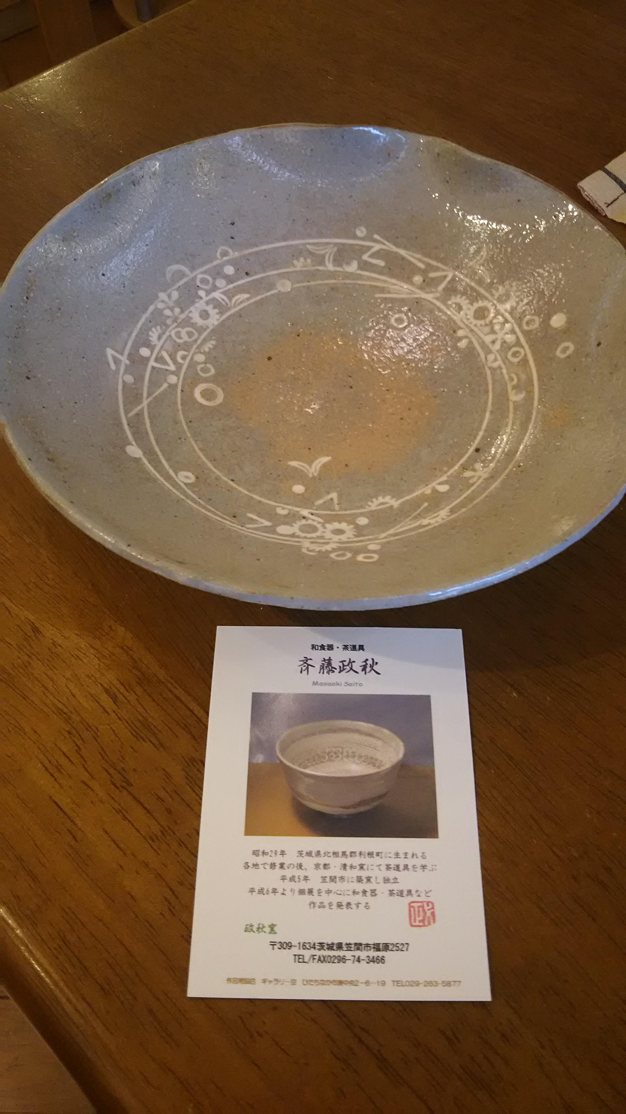 お店では『手のひらの上のステキなモノ』と題した展覧会の開催中とあって、普段では出会うことない作品に触れることができる、またとない機会でした。そこで、今回出会ったのが、一枚のお皿だったんです。斉藤政秋さんという笠間の作家さんで、柔らかなフォルムと優しい色使いに一目ぼれしてしまいました。また、マスターの牧野さんから、作家さんの作品にかける思いや技術の確かさなどの話を聞いて、ますますそのお皿の魅力に引き込まれてしまったんです。