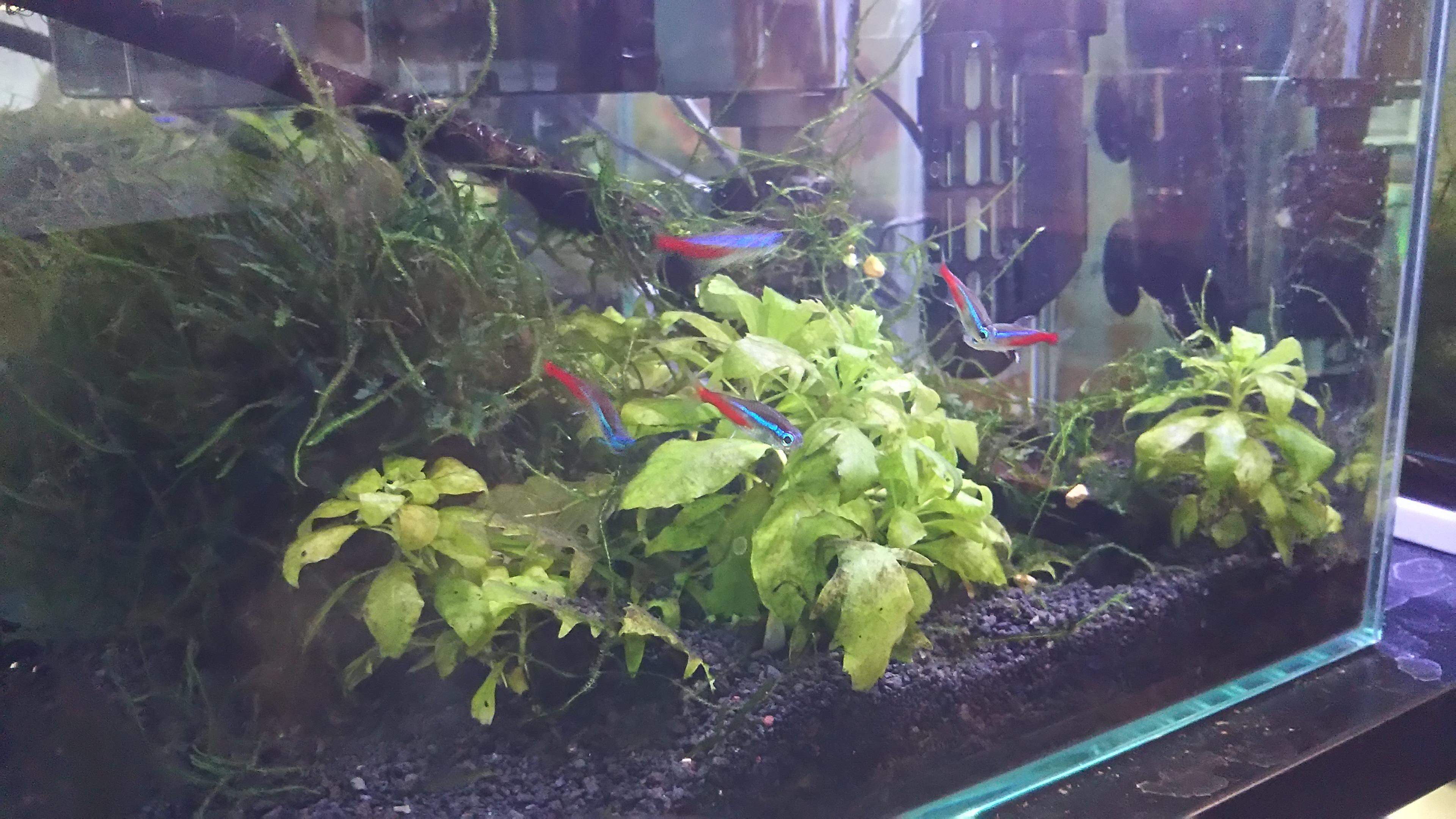 今回掃除をした水槽の中で一番手を焼いたのが店内のメダカを入れていた物で、こんな状態で生きていたのが不思議なくらいに汚れていました。(今まで、ごめんね)続いて、ネオンテトラの水槽に取り掛かったのですが、これが意外と上手くできて、パッと見、アートアクアリウムかな?と、見間違うほどです(笑)思わず、妻を呼んでしまいました!我ながら、Good jopです。