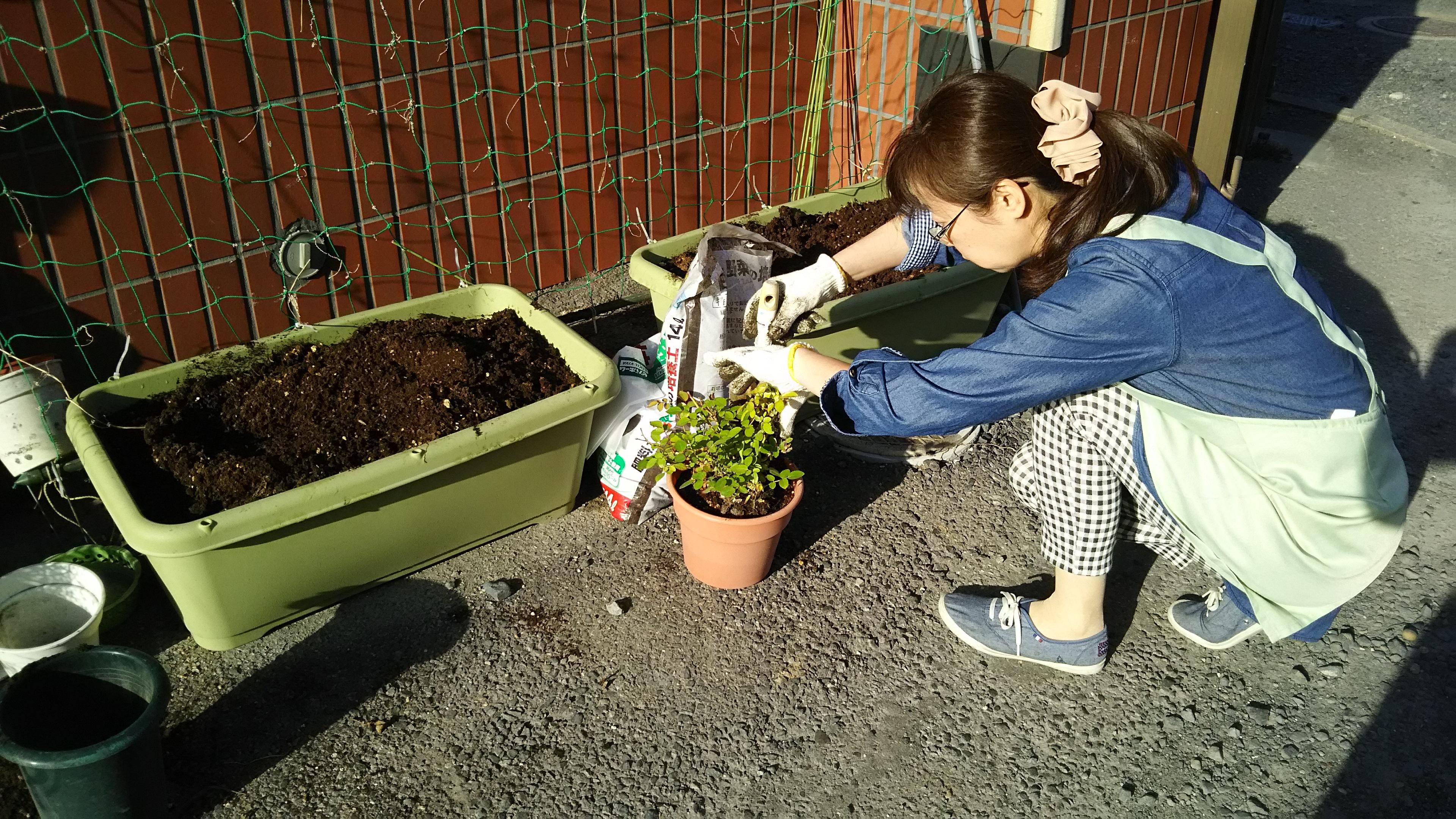 それと同時に、バラの苗木や他の鉢物の植え替えを行いました。ぎっしりと詰まってしまった根っこをほぐして、新しい土を入れた少しだけ大きめの器に植え替えます。また、ゴーヤを植えるプランターも、硬くなってしまった土をほぐしながら化成肥料を混ぜ込んで、ふっくらとした土壌を創っていきます。