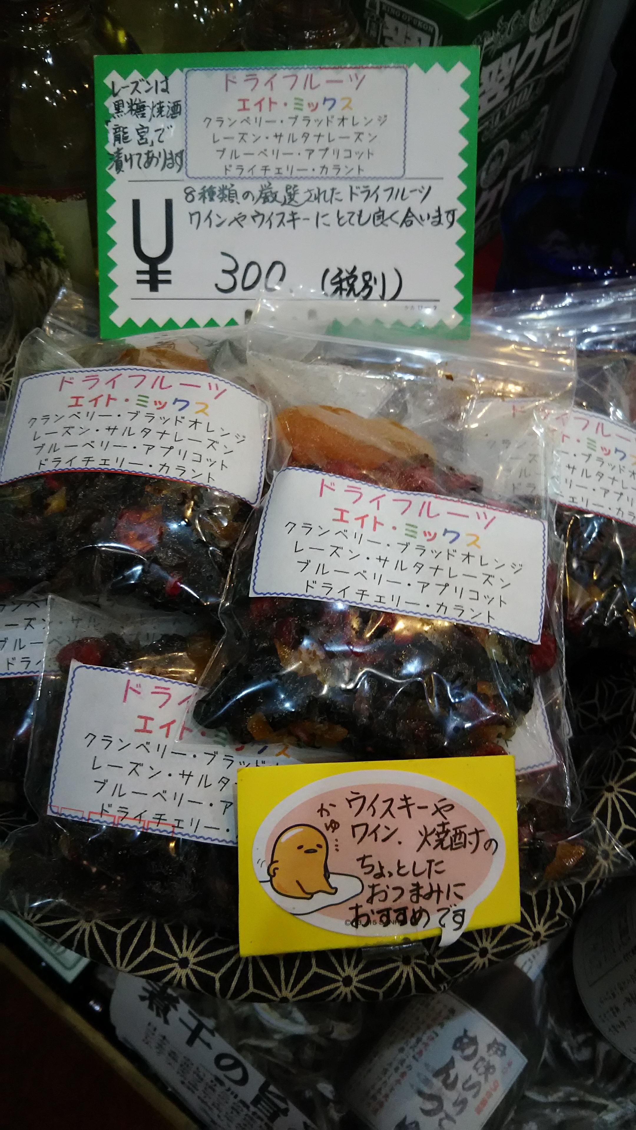 昨年から発売を始めました、当店オリジナルの『ドライフルーツ・エイトミックス』が、お陰様で沢山の方々から好評を頂いています。発売当初は、なかなかお手に取ってもらえなかったのですが、御来店いただきましたお客様に御試食して頂いたり、発売の経緯などを丁寧に説明していううちに、少しずつお買い求めいただけるようになりました。