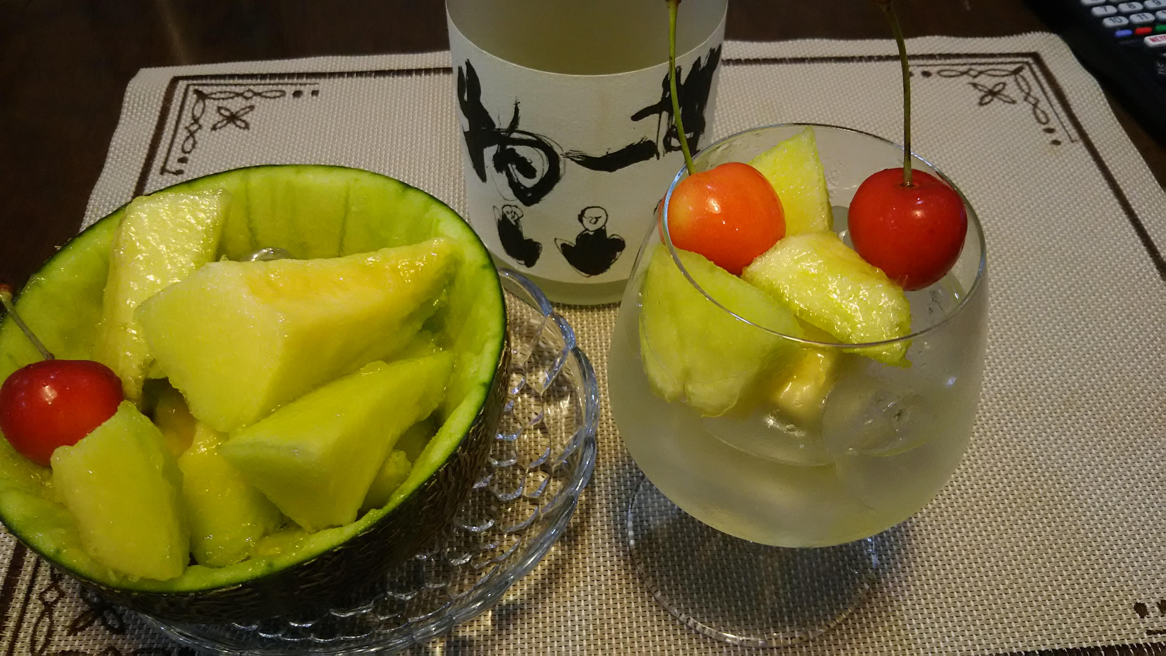 時を同じくして、山形から届いたサクランボを、彩りとして飾りつけると、見た目にも超豪華なフルーツパンチが出来上がったのです。せっかくなので、麦焼酎ハイボールにもカットしたメロンを盛り合わせてみたのですが、これがまた絶品で、みどりさんも気に入っておかわりをしていました。