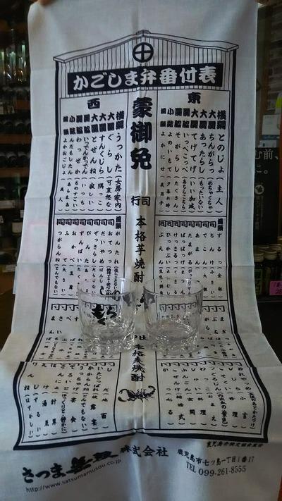 本日より『紫もぐら』1.8L 3,000円(税抜)をお買い上げの方に、『特製焼酎グラス』または、『オリジナル手ぬぐい』のどちらか一つを差し上げています。尚、数に限りがありますので、無くなり次第、終了とさせて頂きます。