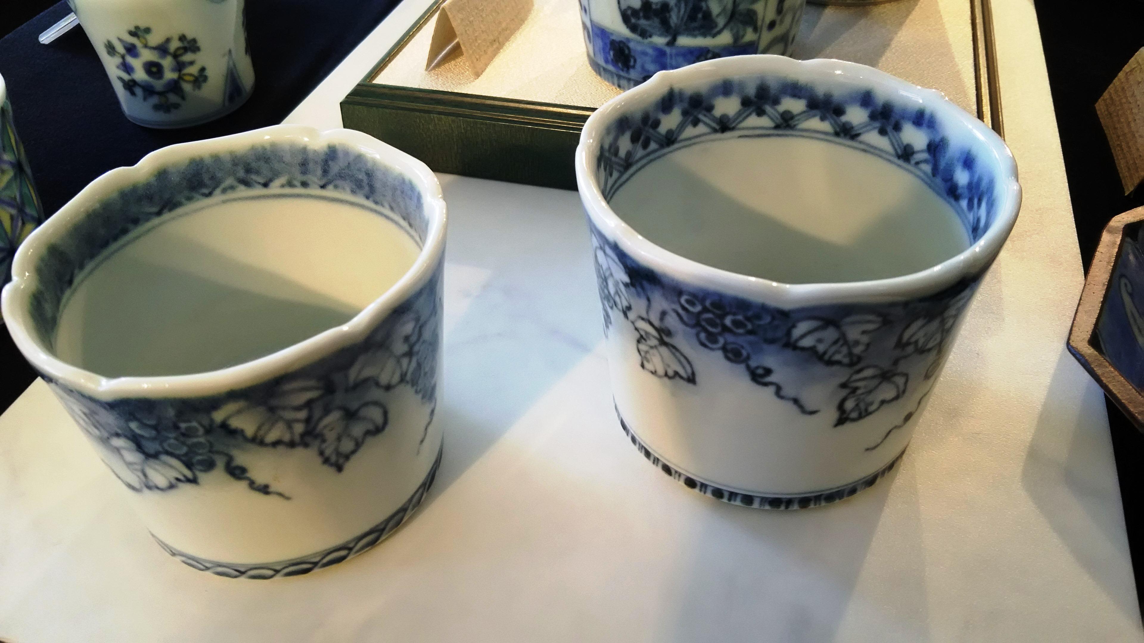店内には、沢山の作品が所狭しと並べられ、蕎麦猪口一つとっても、目移りしてしまうほどです。その中でも、真っ先に目に飛び込んできたのが、今回手に入れた夫婦茶碗ならぬ『夫婦蕎麦猪口』だったんです。早速手に取ったところ、サイズ感もぴったりで、蕎麦猪口以外に、何にでも使える様な気がしました。綺麗な白地には、藍色で描かれた葡萄の絵が、とても涼しげに思えます。