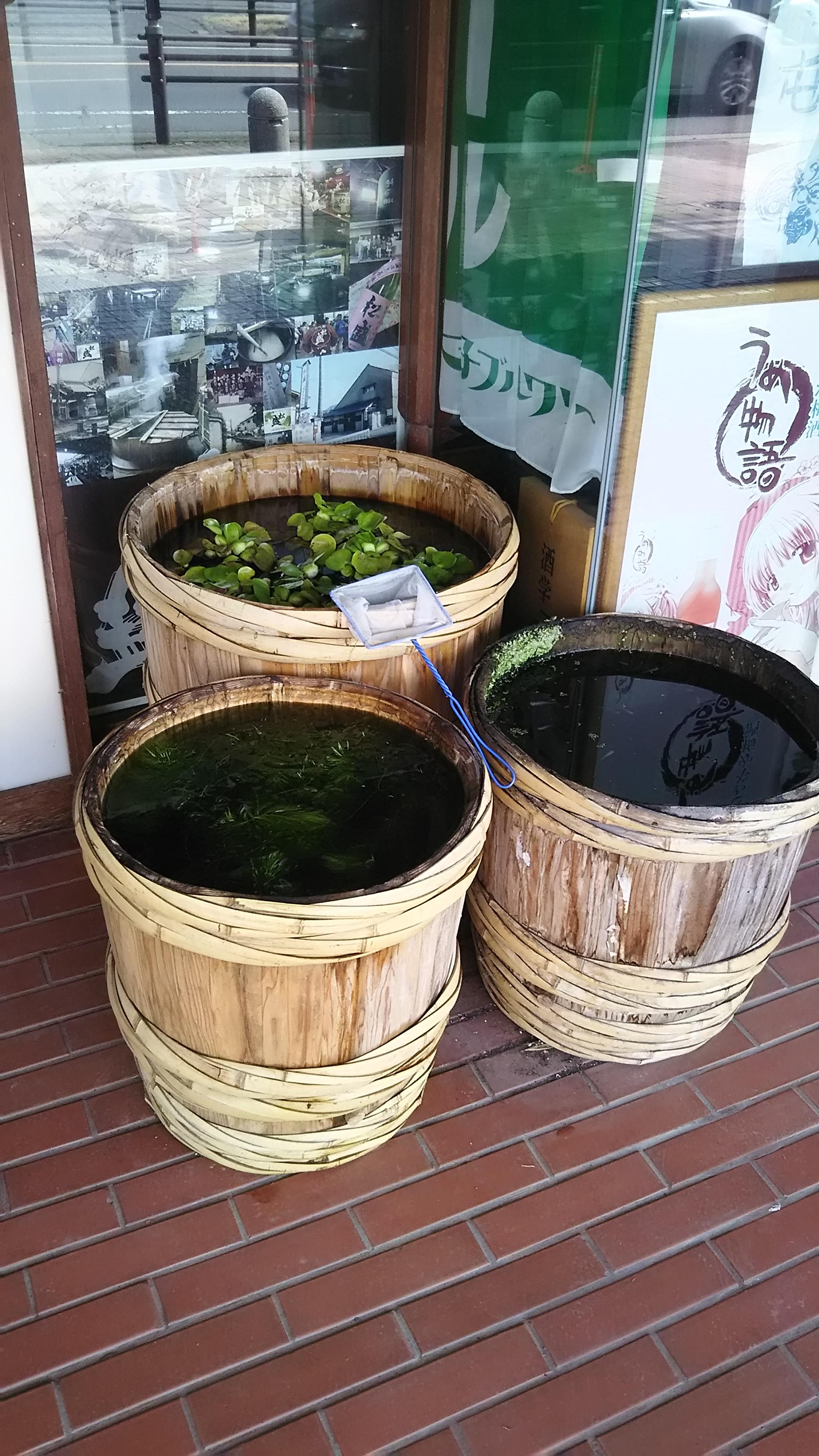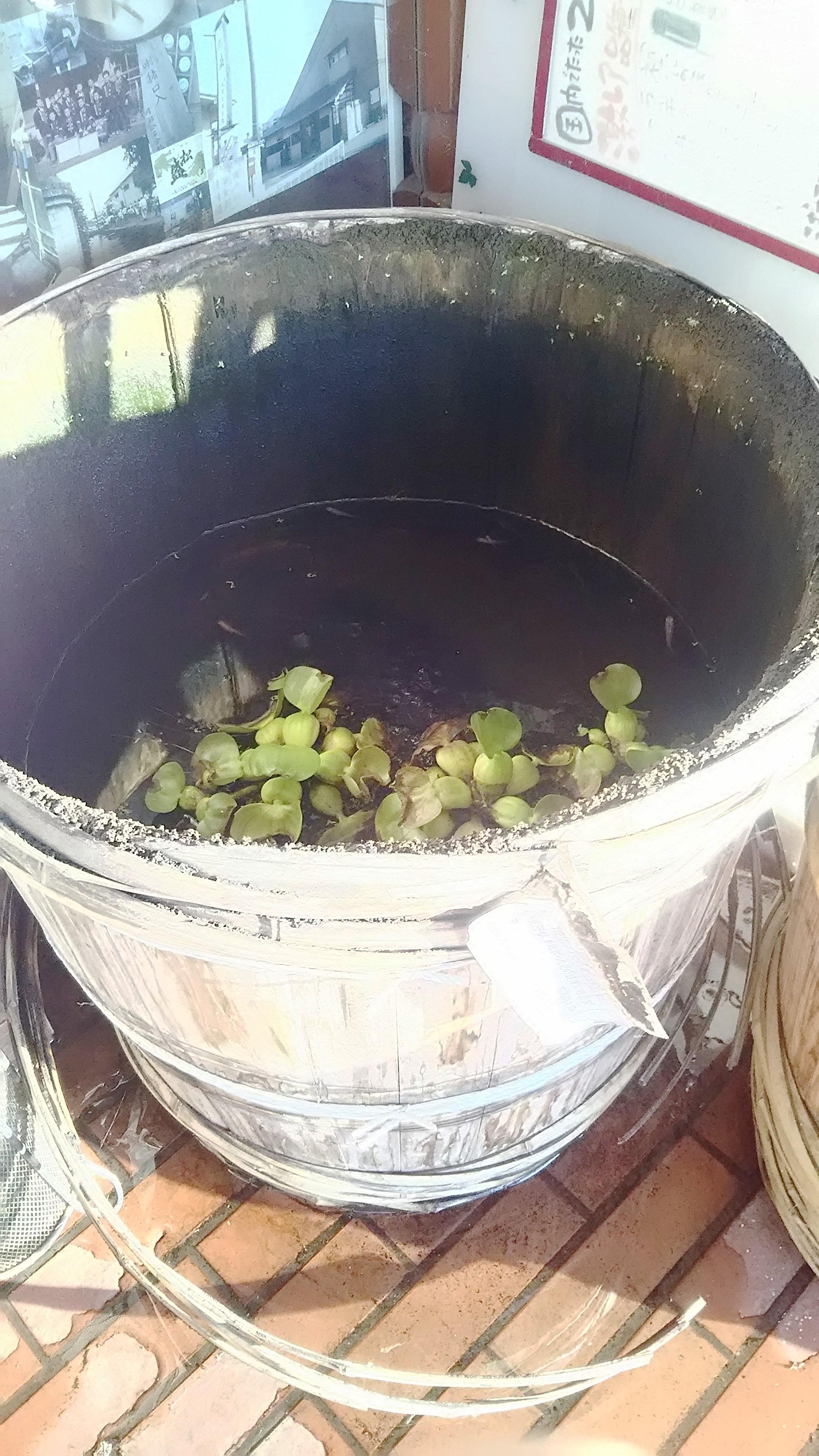 それぞれの樽には、色とりどりのメダカたちが元気に泳いでいますので、ご来店の際は、是非、樽の中をのぞいてみてください(笑)