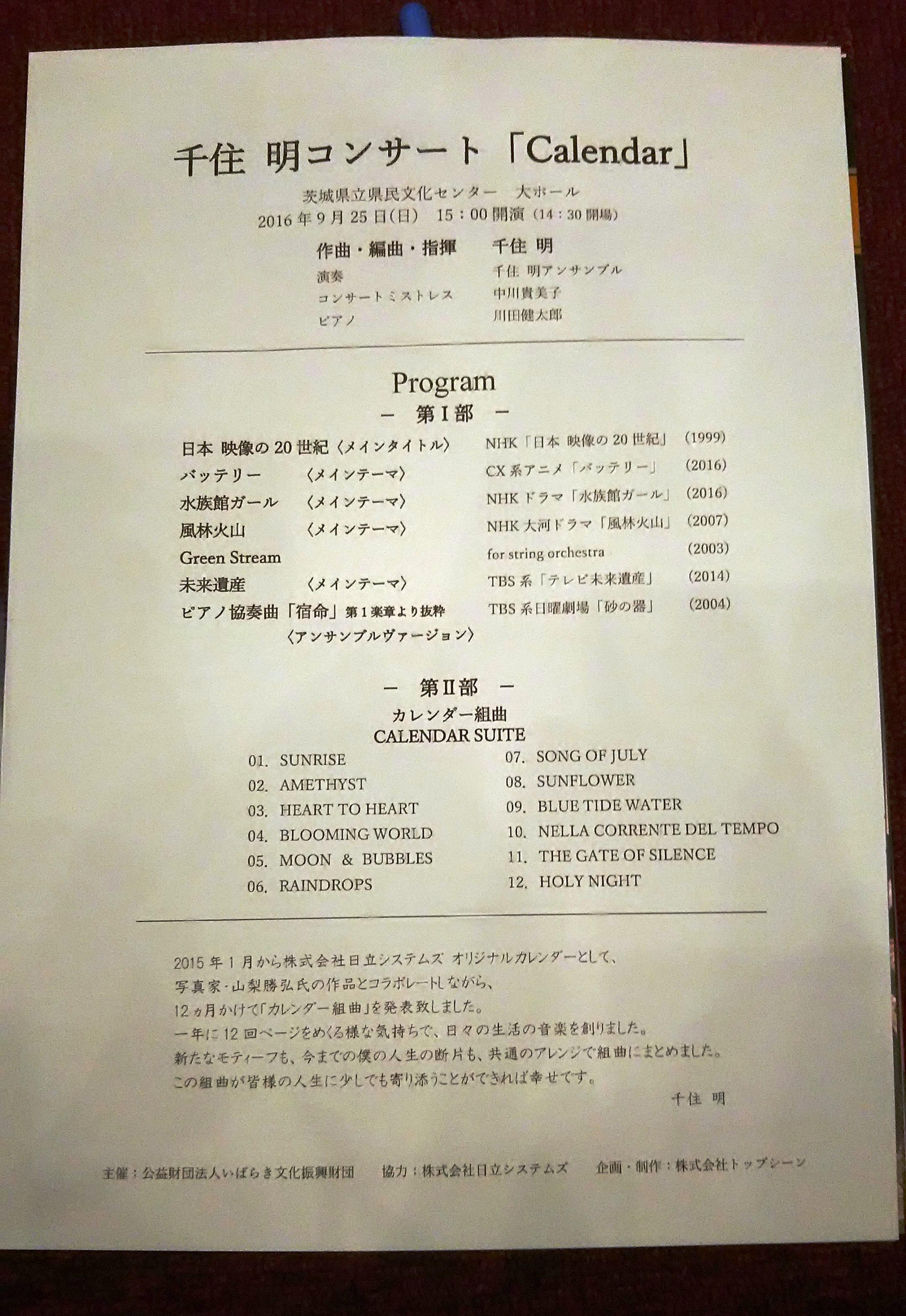 昨日は、前々から楽しみにしていた千住明さんのコンサート『Calendar』を聴きに県民文化センターへ行ってきました。文化センターは私の自宅から近く、以前から良く知っていますが、大ホールに入る事なんて数えるほどです。
