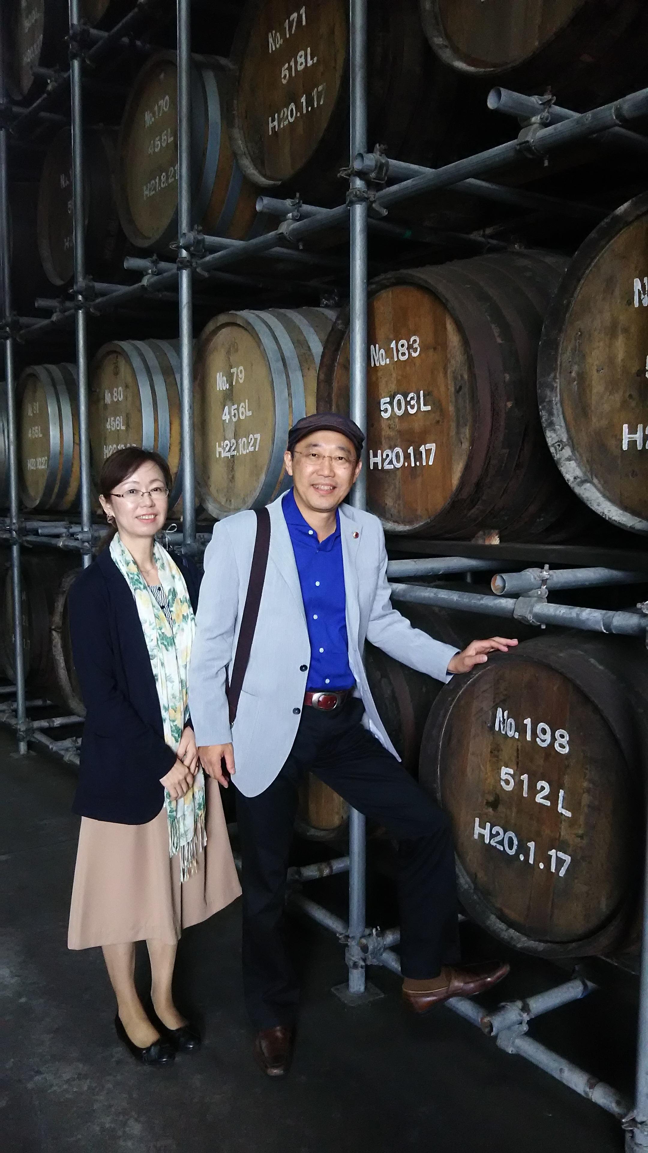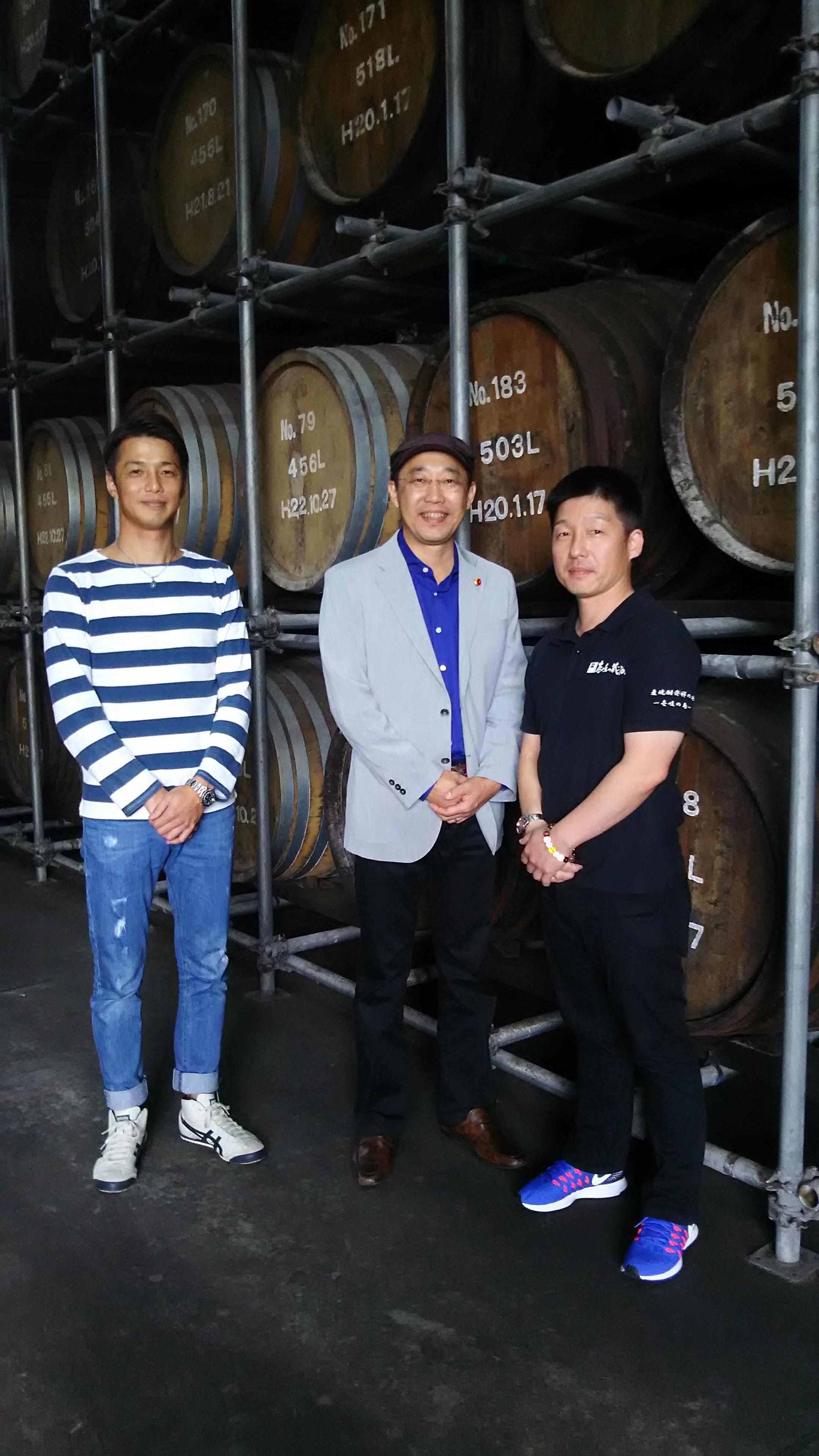 せっかくなので、石橋副社長と吉田専務を誘って、樽の前で記念撮影をさせていただきました。この樽の中で眠っているのは、壱岐の蔵さんの代表銘柄の『無一物』です。シェリー樽で熟成された甘い香りが魅力的なお酒で、当店の人気ナンバーワンです。レモン炭酸で割ったハイボールは、みどりさんの大のお気に入りなんですよ!いつか『樽ごと一本買います!』って言えるように頑張ろうね~とみどりさんと話しました(笑)