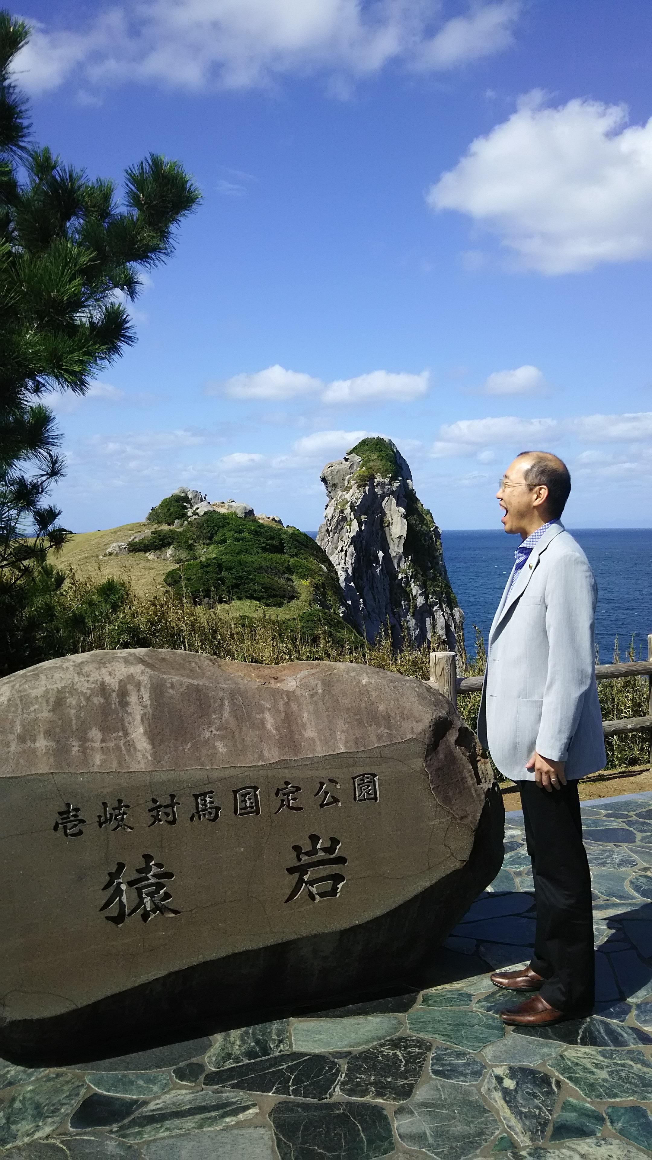 その中で今回どうしても自分の目で見たかった所が『猿岩』なんです。黒埼半島の先端にある高さ45mの岩で、その姿が猿の横顔に似ていることから『猿岩』と呼ばれており、当店の人気麦焼酎・天の川酒造さんの『モンキーロック』のモデルにもなっています。実物は写真で見るよりも鮮やかで、海の色とのコントラストがとても綺麗でした。その猿岩をバックに記念撮影をしてきました。猿岩と同じポーズです(笑)