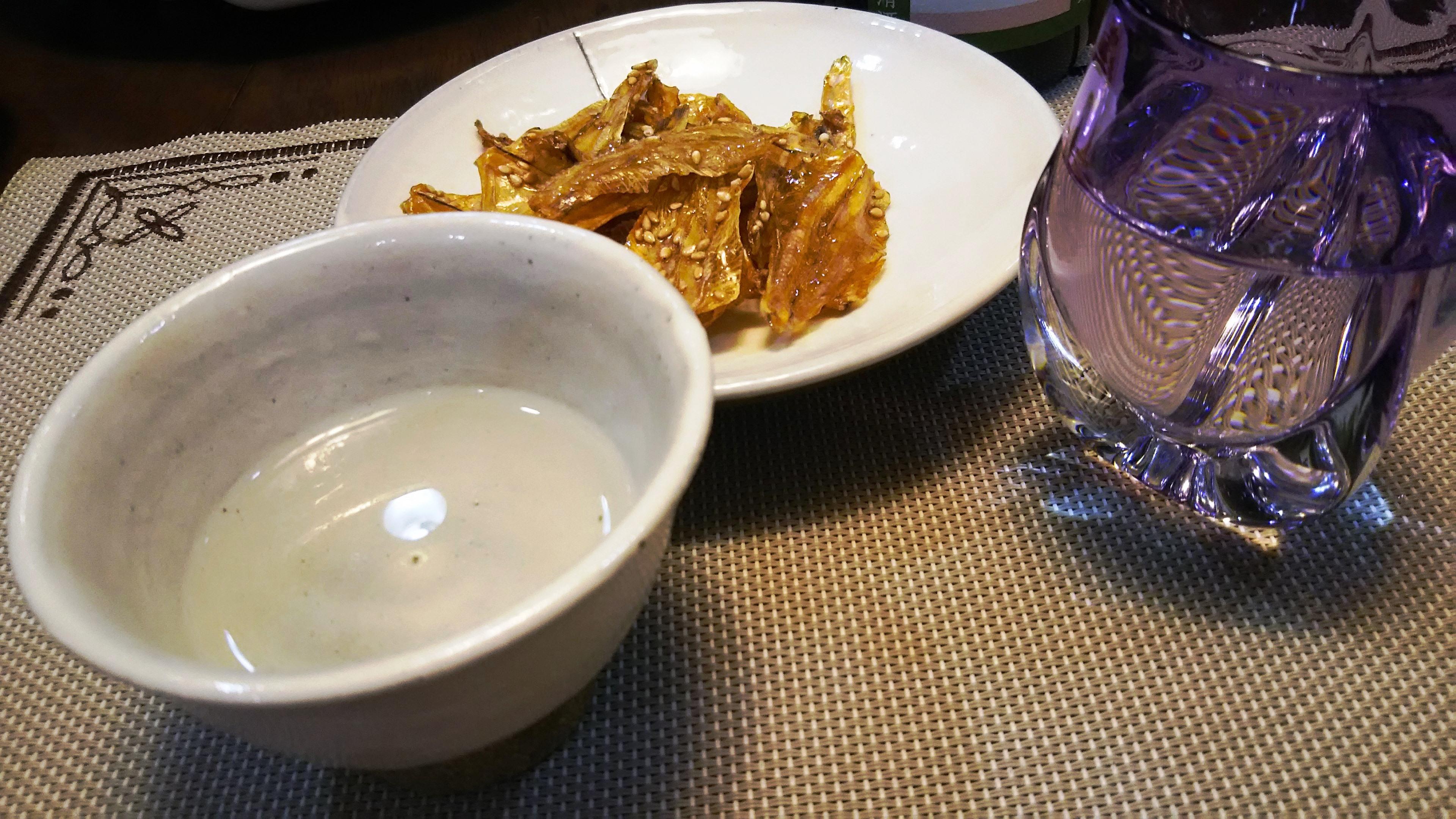 もう一つは、『熟成大吟醸・枯淡(コタン)』を陶製の小ぶりな猪口に注いで頂きました。ほのかに黄金色の輝きを放ち、芳醇な香りを漂わせるこの酒は、口の中に入ると意外とドライで、後口に爽やかな旨味が広がります。今回は、常温でいただきましたが、温めた時の美味しさを想像するだけで、期待が膨らみます(笑)