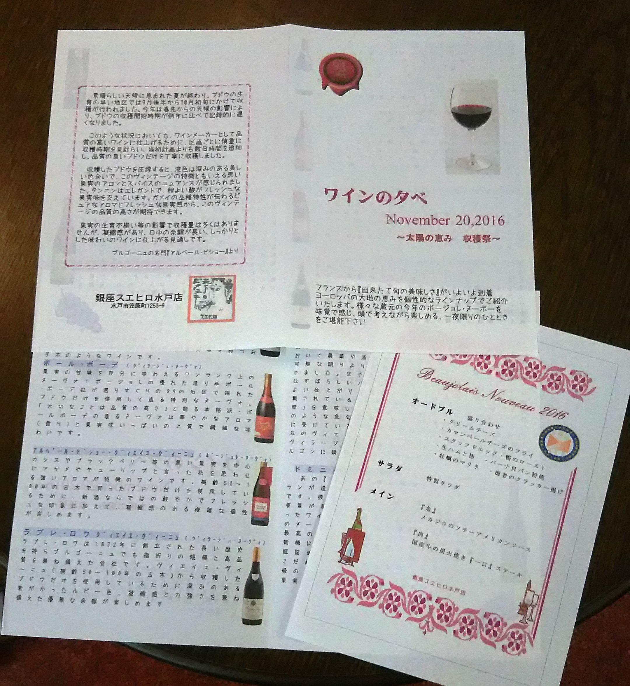 実は、今日も明日の『ヌーヴォ・パーティ』にお配りするしおりをコツコツと作成しています。もちろん、店番もしっかりとこなしていますよ~(笑)今回は、6種類のワインそれぞれの商品説明と味わいの紹介を書いた見開き版となっています。また、表紙の裏面には今年のブドウの作柄情報を書いてみました!そして、当日の料理のメニューを差し込んで完成です。