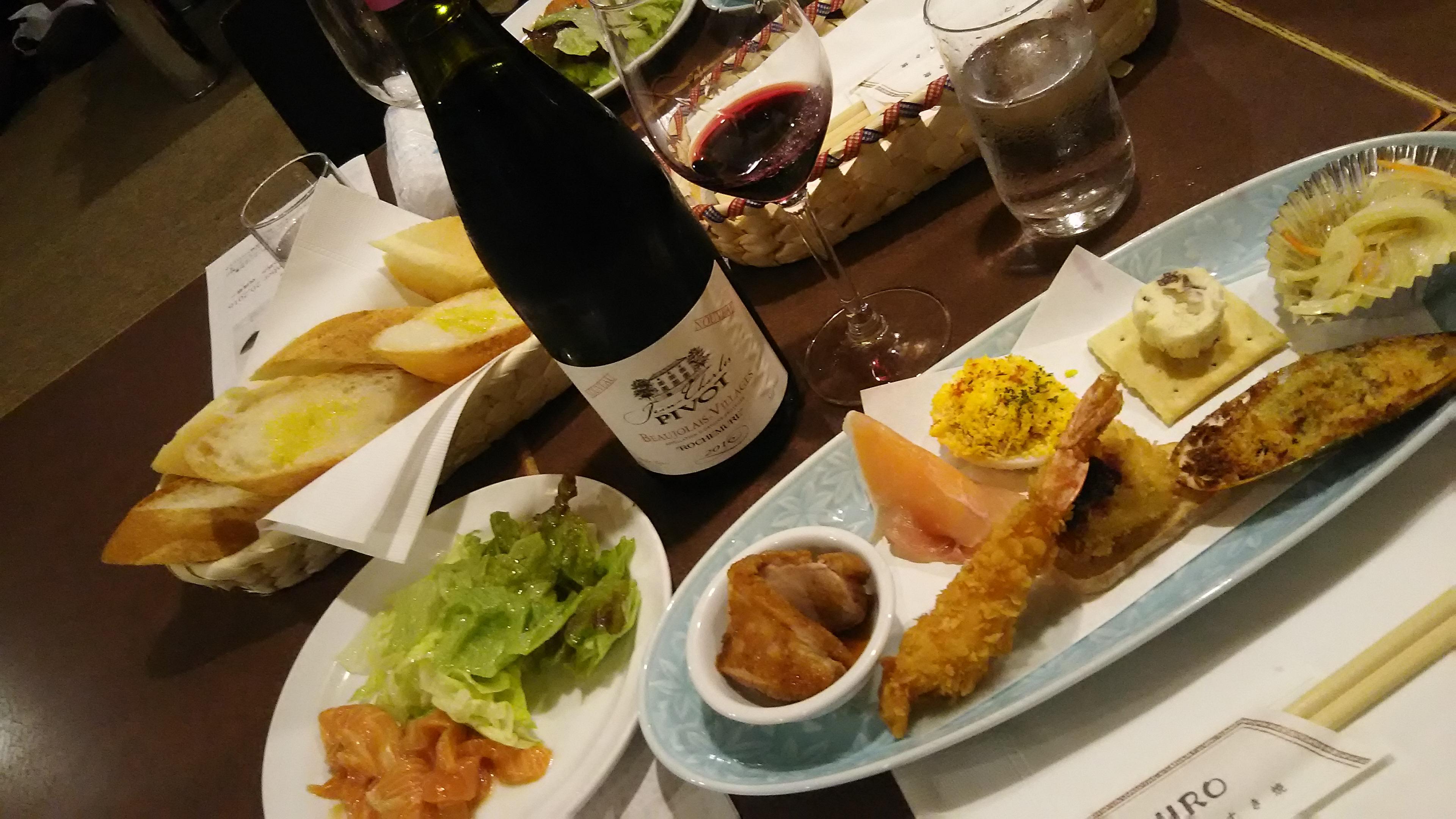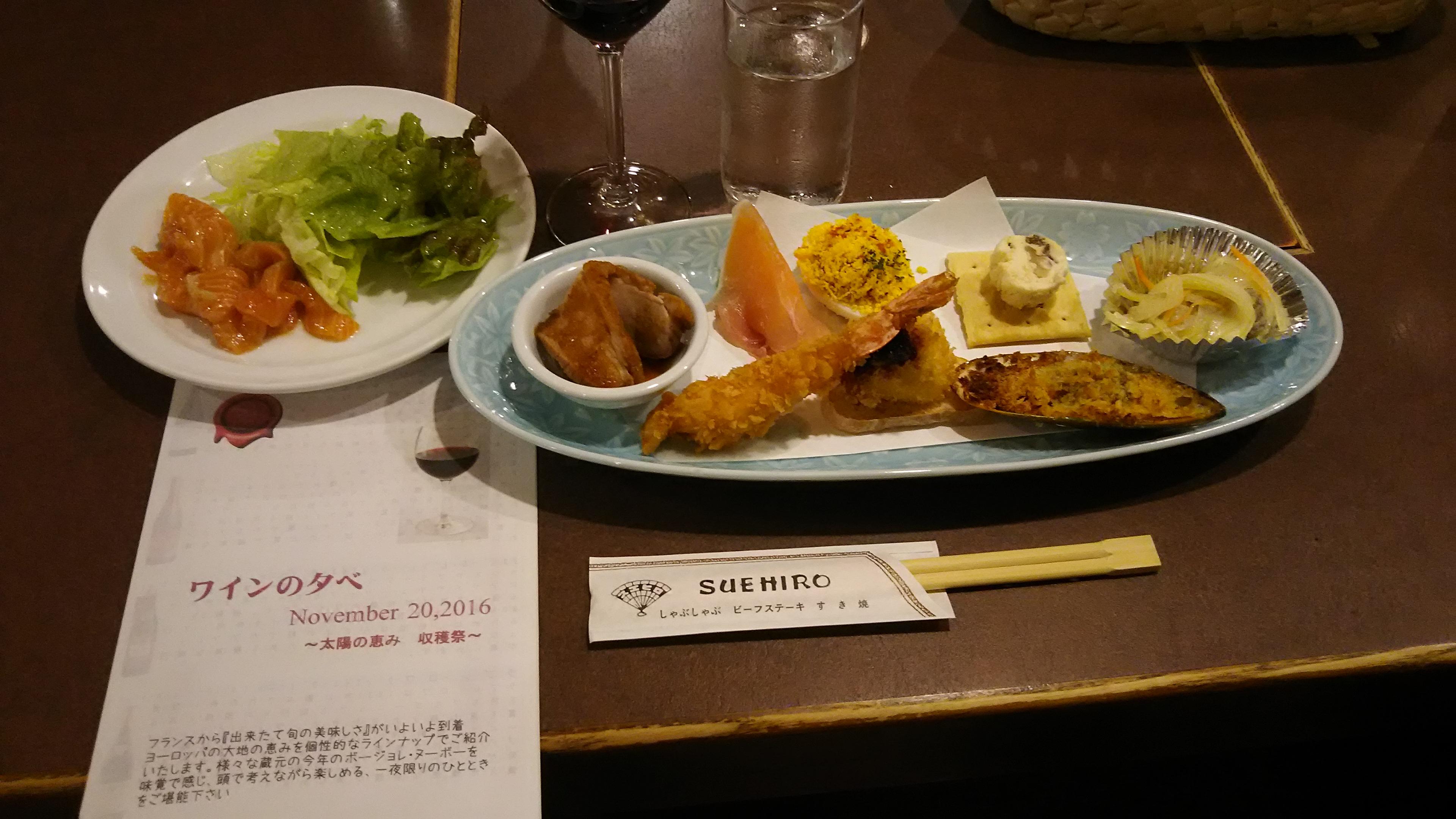 今回も会場としてご協力いただきました『銀座スエヒロ水戸店様』には、ワインを楽しめるように、特別メニューを出していただきました。毎回大好評の『前菜8種盛り』、通称晩酌セットは、いつにもまして豪華な内容でした!特製サラダに至っては、サーモンとレタスがてんこ盛りで、これで1人前?と思える量です。また本格的なワイングラスまで準備して頂き、至れり尽くせりのサービスに大感激です。