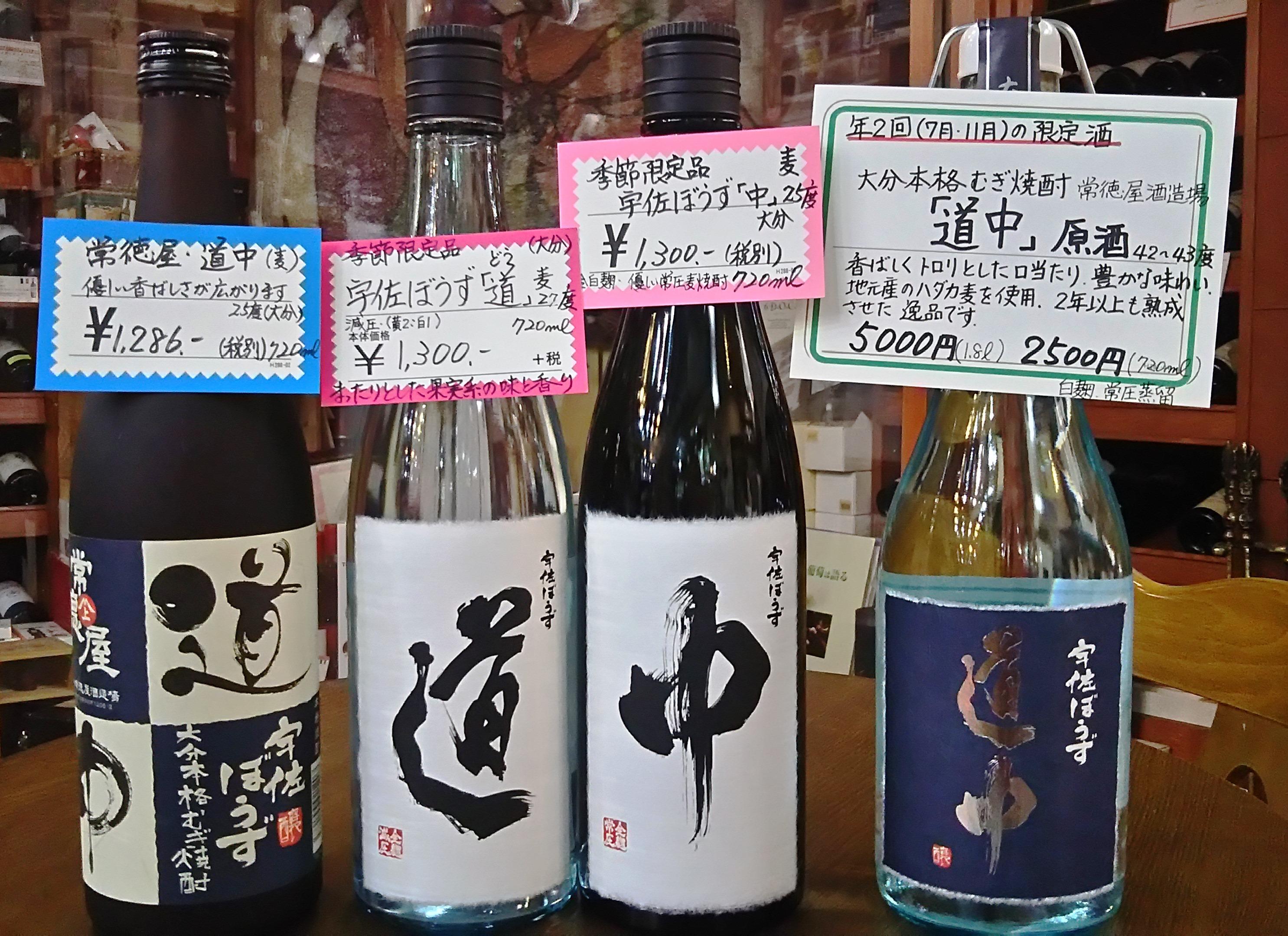 その『宇佐ぼうず』を贅沢に使うことで、甘く香ばしい、麦チョコのような香りの麦焼酎『道中』が生み出されるんです。その『道中』には、季節限定の物があり、今回はナント!三種類が同時に顔をそろえました。こんなことは滅多にある事ではないので、この機会を逃すまいという事で、今回、ご紹介することにしました。