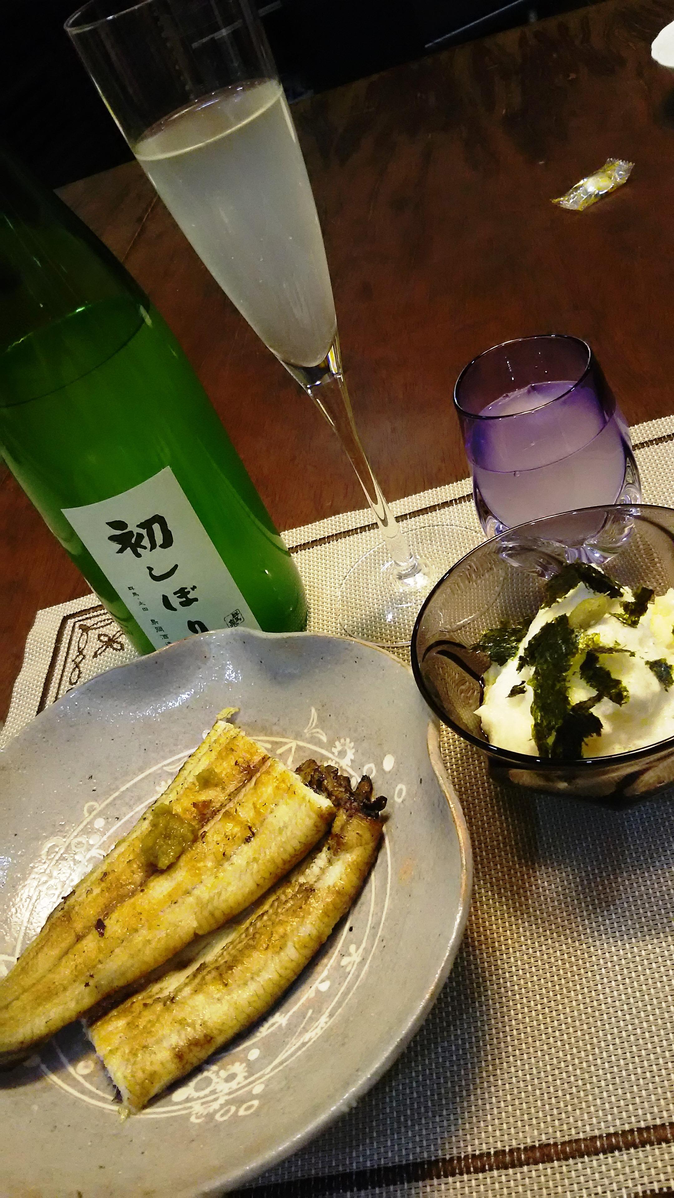 もう一品は、千葉に住む友人から送られてきた『鰻の白焼き』を柚子こしょうでいただくことにしました。貴重な三河さんの国産ウナギとあって、ふっくらとした身に上品な脂が乗っていました。そして、お酒は、シャンパン用のフルートグラスとガラスのぐいのみの二種類の器を用意して、香りと味わいを楽しむことにしました!
