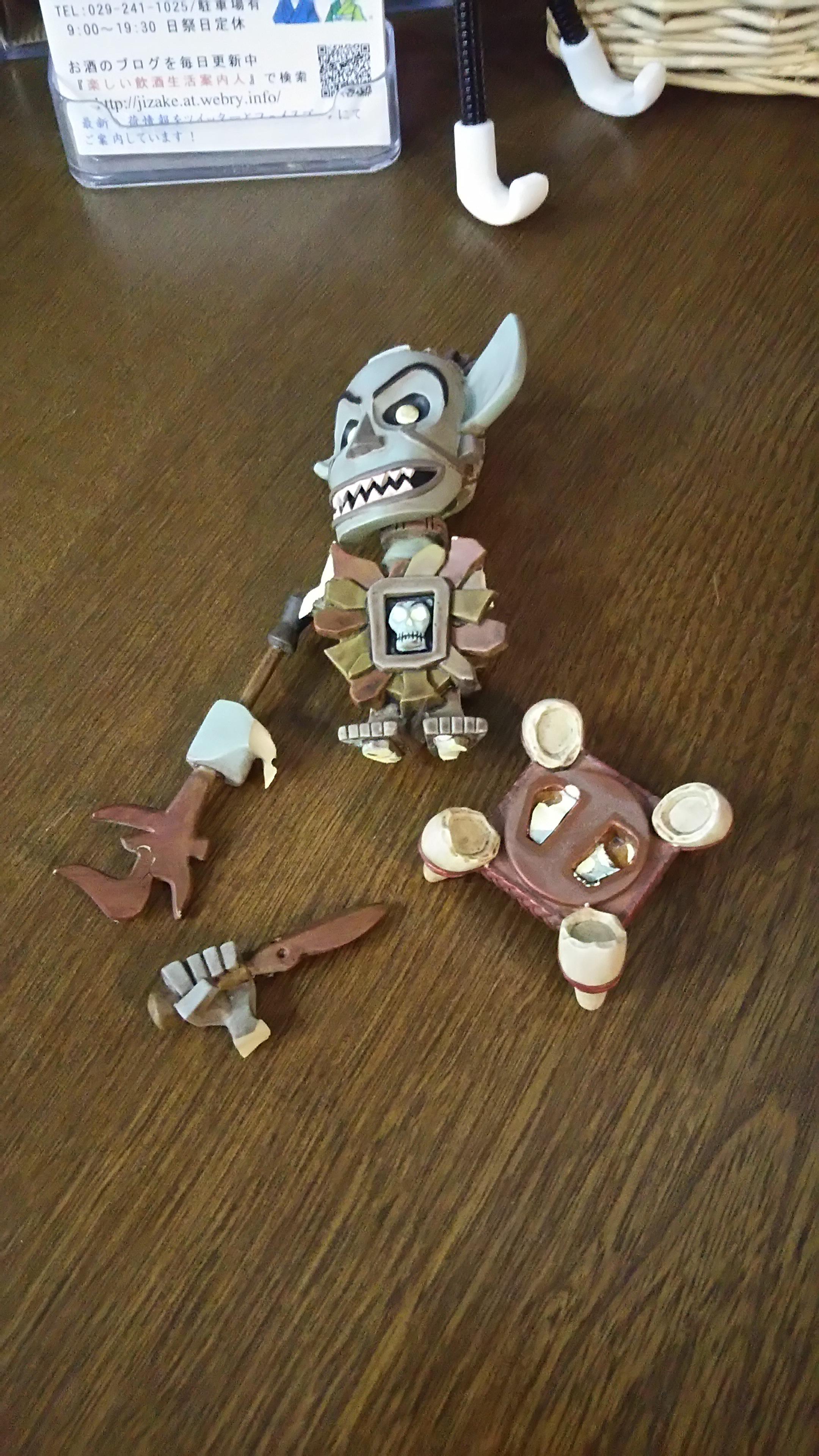 その人形は『シリキ・ウトゥンドゥ』と言いって、以前、ディズニーシーに行った際に、一目惚れして買い求めた物でした。その怪し気な雰囲気から、店内のお酒を陳列する際には必ず登場しており、今回も店内中央のテーブルに飾っていたところ、今回の地震で見るも無残な姿に変わり果ててしまいました。しかし、裏を返せば、今回お酒が一本も割れなかったのは、彼が身代わりになってくれたせいかもしれません・・・。