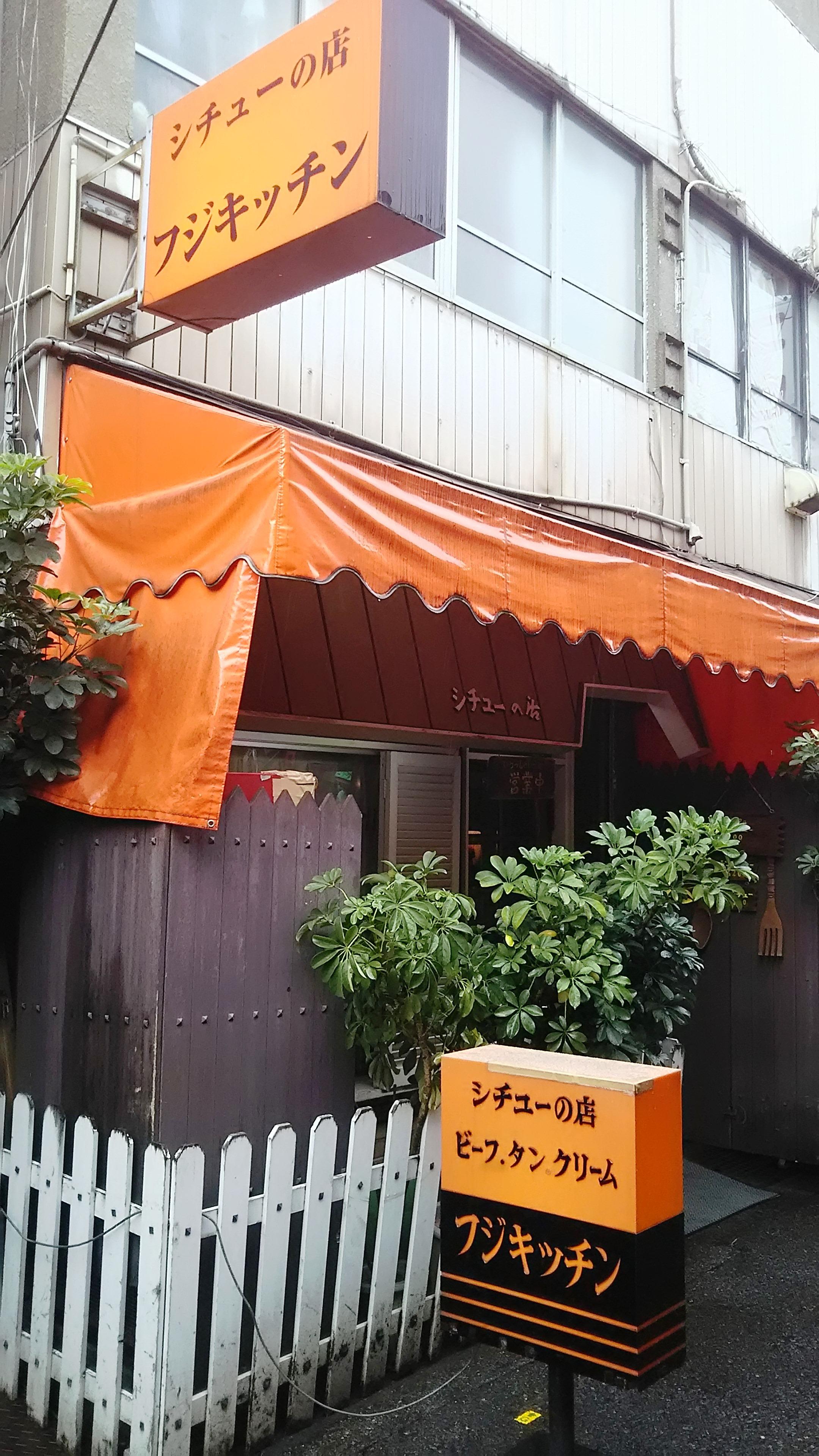 この日の浅草は、小雨が降る肌寒い天気にも関わらず、着物姿の新成人の若者や外国人の観光客で溢れていて、傘をさして歩くのも大変なくらいに混雑していました。雷門を横目に裏路地を歩いていくと、お店のトレードマークでもある『オレンジ色の看板』が目に飛び込んできました。そこには話に聞いていた通りに『シチューの店 フジ・キッチン』と書かれていました。