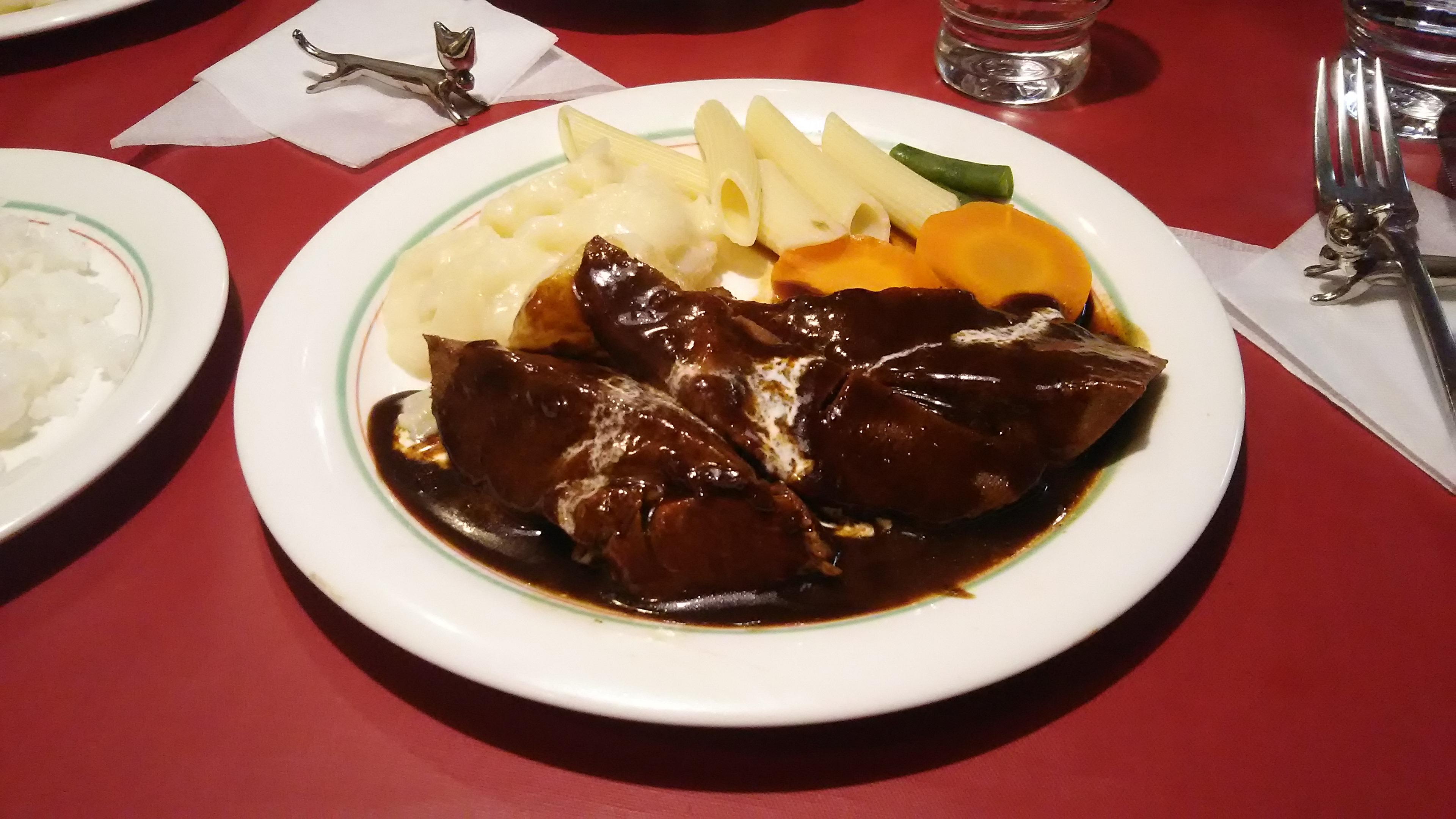 しばらくすると、待ちに待った『タンシチュー』が運ばれてきました。この日は、もう一つのお勧め『ハンバーグ・シチュー』も注文しました。肉厚のタンシチューは、フォークで触るだけで崩れ、口の中でとろけてしまう柔らかさです。付け合せには、ホワイトソースのジャガイモとペンネのパスタなどがあって、この一皿で十分にお腹がいっぱいになってしまいます。また、ハンバーグにはビーフシチューソースがかかっていてびっくりしました!