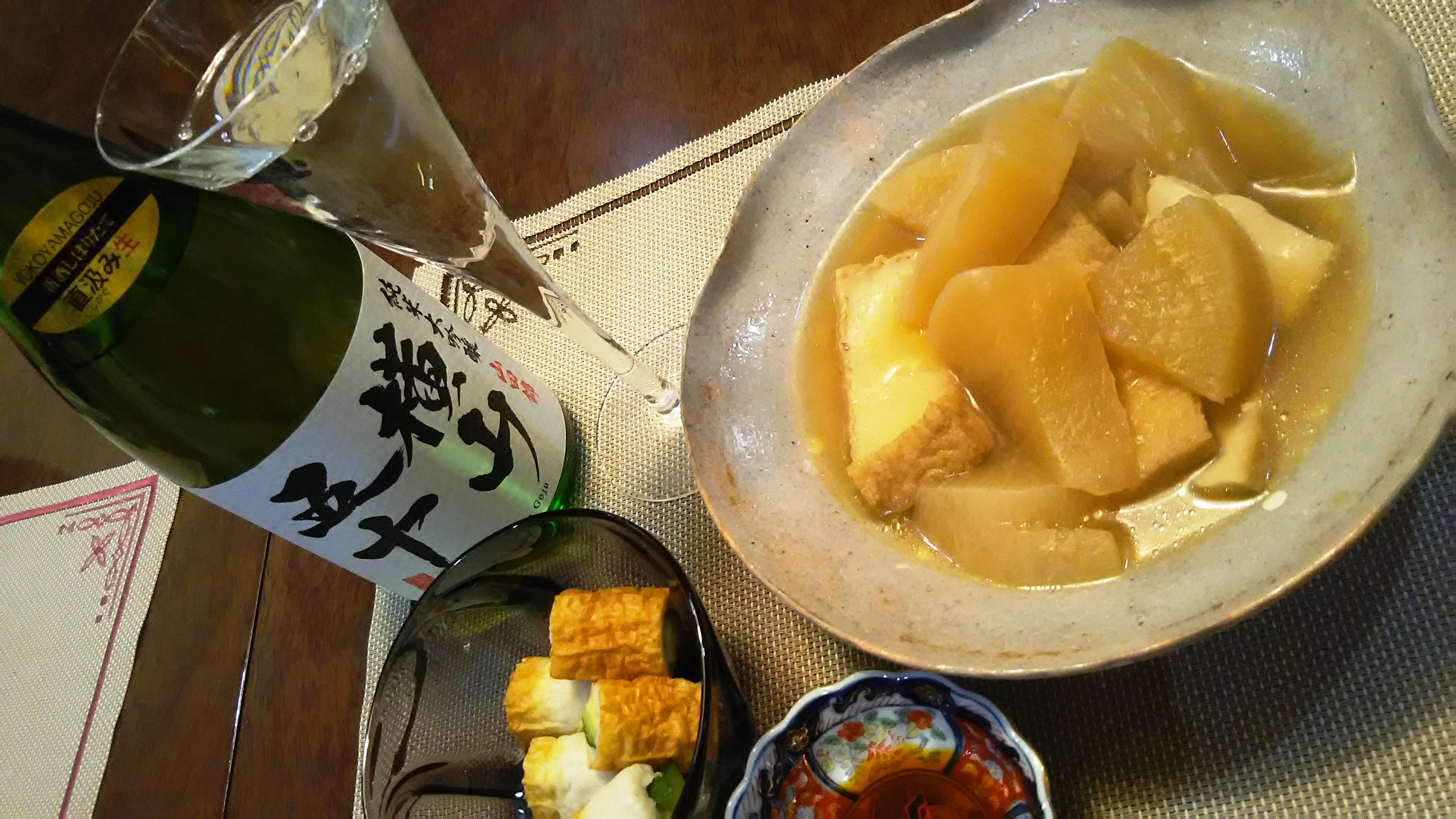 この日用意した『大根と厚揚げの煮物』と食べ合わせてみると、これが絶妙のハーモニーを奏でてくれるんですよ(笑)甘みと旨味を含んだ煮物と、甘いのに軽やかな後口のお酒との相性の良さを改めて知ることができました。お酒だけを飲み続けていたらその甘さに飽きてしまったかもしれませんが、煮物と合わせたことで、円やかな味わいのお酒へと変わって行きました。