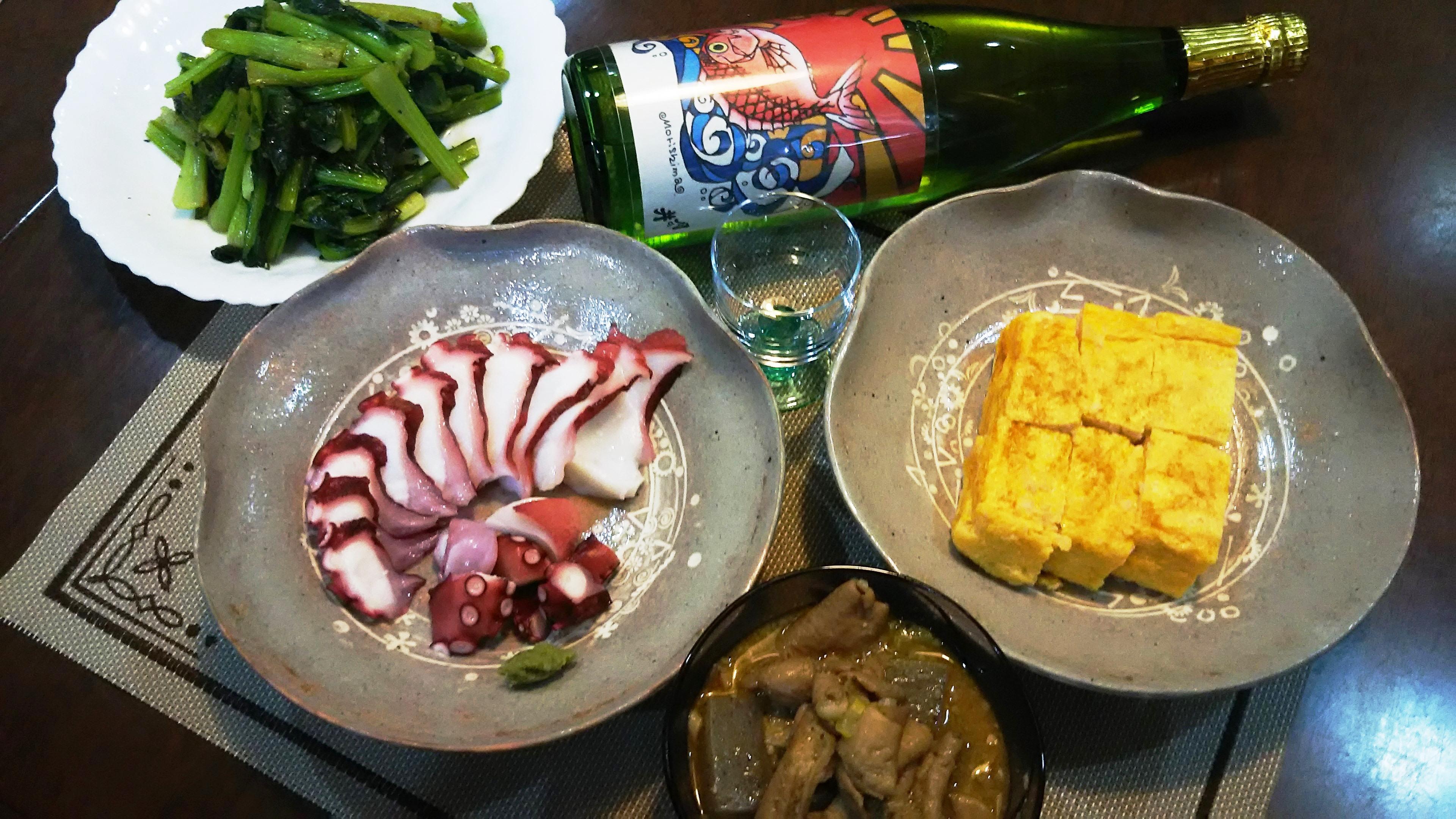 おつまみには、春らしく小松菜の炒め物と、タコのお刺身を少々、玉子焼き専門店で買い求めた『親子焼き(鳥そぼろ入り)』と同店のモツ煮込みをそろえてみました。アッサリとしたタコや玉子焼きと一緒に飲むと、甘く芳醇な香りが引き立ち、スッキリとした後口を楽しむことができます。一方、モツ煮込みなどと合わせると、力強いコクと旨味が感じられます。
