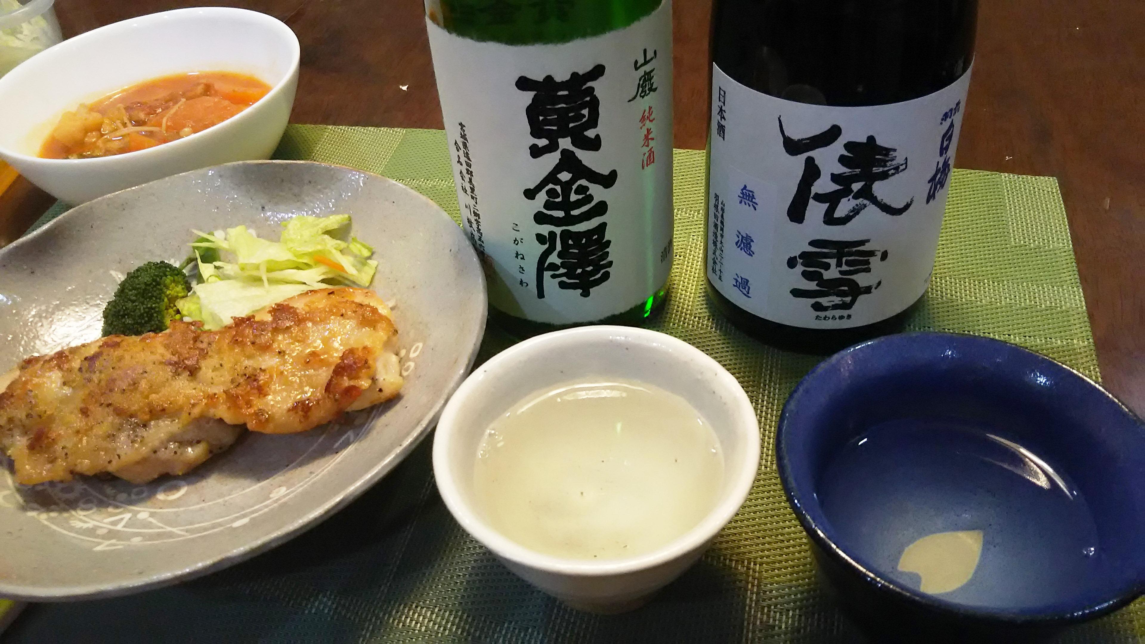 そんな、酒造りの巨匠が造ったお酒を飲むに当たって、今回は敢えて日本酒には似つかわしくなさそうな『チキンステーキ』と『トマトスープ』を合わせてみることにしました!まずはじめに『黄金澤・山廃純米生原酒』から頂きます。香りは弱くトロリとした飲み口で、口の中に一気に旨味と甘味が広がり、芳醇な旨味がいつまでも続きます。ガーリック醤油味のチキンの濃厚で力強い味わいと、お酒の持つコクと旨味とのバランスがとても良く合います。