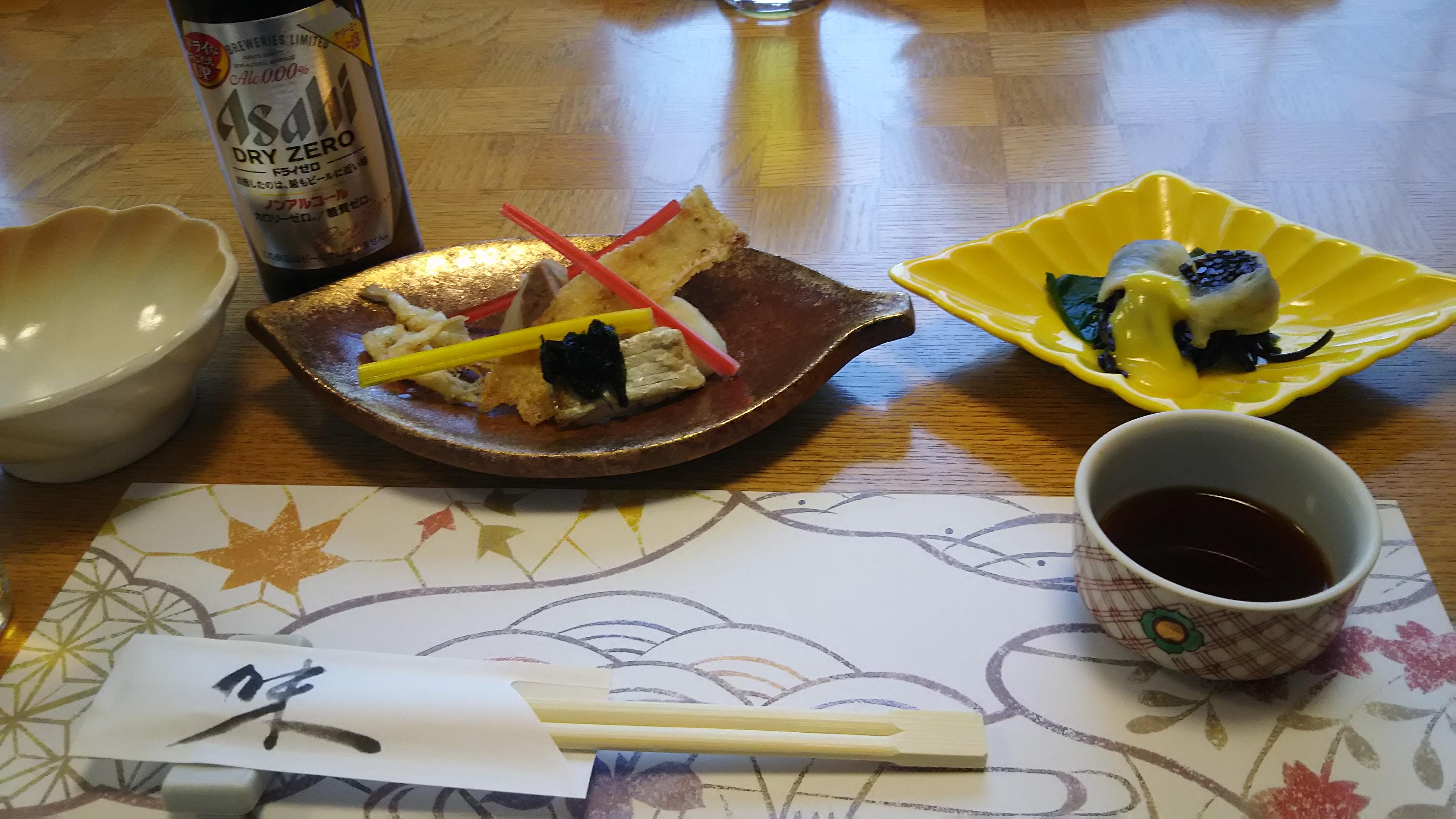 続いて運ばれてきた『お造り』は、春を告げる魚『サヨリ』を中心とした6点盛りの酒呑みには嬉しい豪華版!炊き合わせや鮟肝などにも職人技が盛り込まれ、繊細な味わいを楽しみました。こうなっては、日本酒が欲しくなってしまいます(笑)もちろん、茨城を代表する地酒『渡舟・純米吟醸』と『霧筑波・吟醸生』をグラスで頂きました。残念ながら、私はこの日は運転手でしたので、ノンアルコールビールで我慢です。