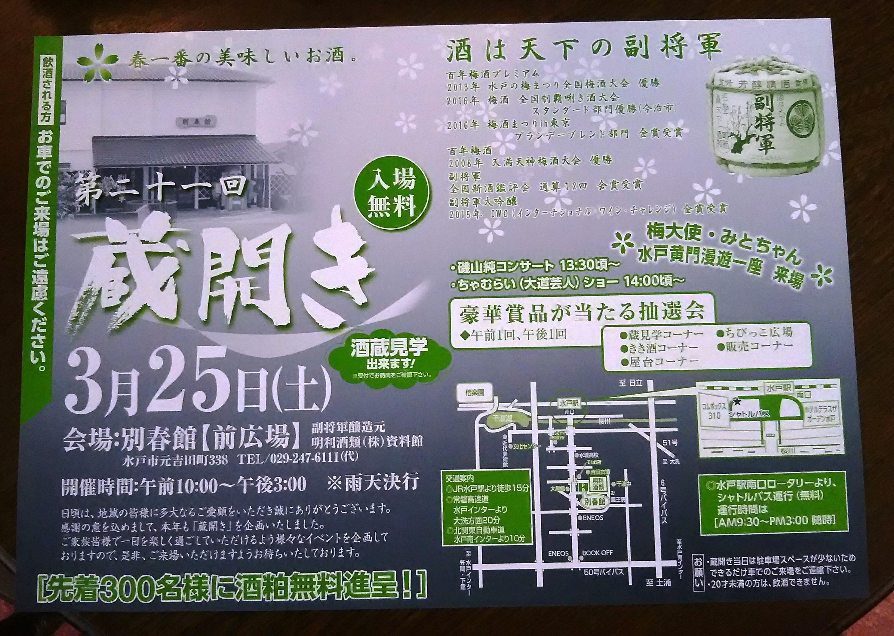 今年で21回目を迎える蔵開きは、3月25日土曜日の午前10時から午後3時まで蔵元の資料館『別春館』前の広場で開催されます。当日は、雨天決行で、コンサートや大道芸のショー、大抽選会など、様々な催し物が行われ、家族みんなで楽しむことができます。そこはまるで、お酒のワンダーランドの様です。ミッキーはいませんが(笑)、水戸の梅大使や水戸黄門一座、水戸のゆるキャラ、みとちゃんが来場するそうです。