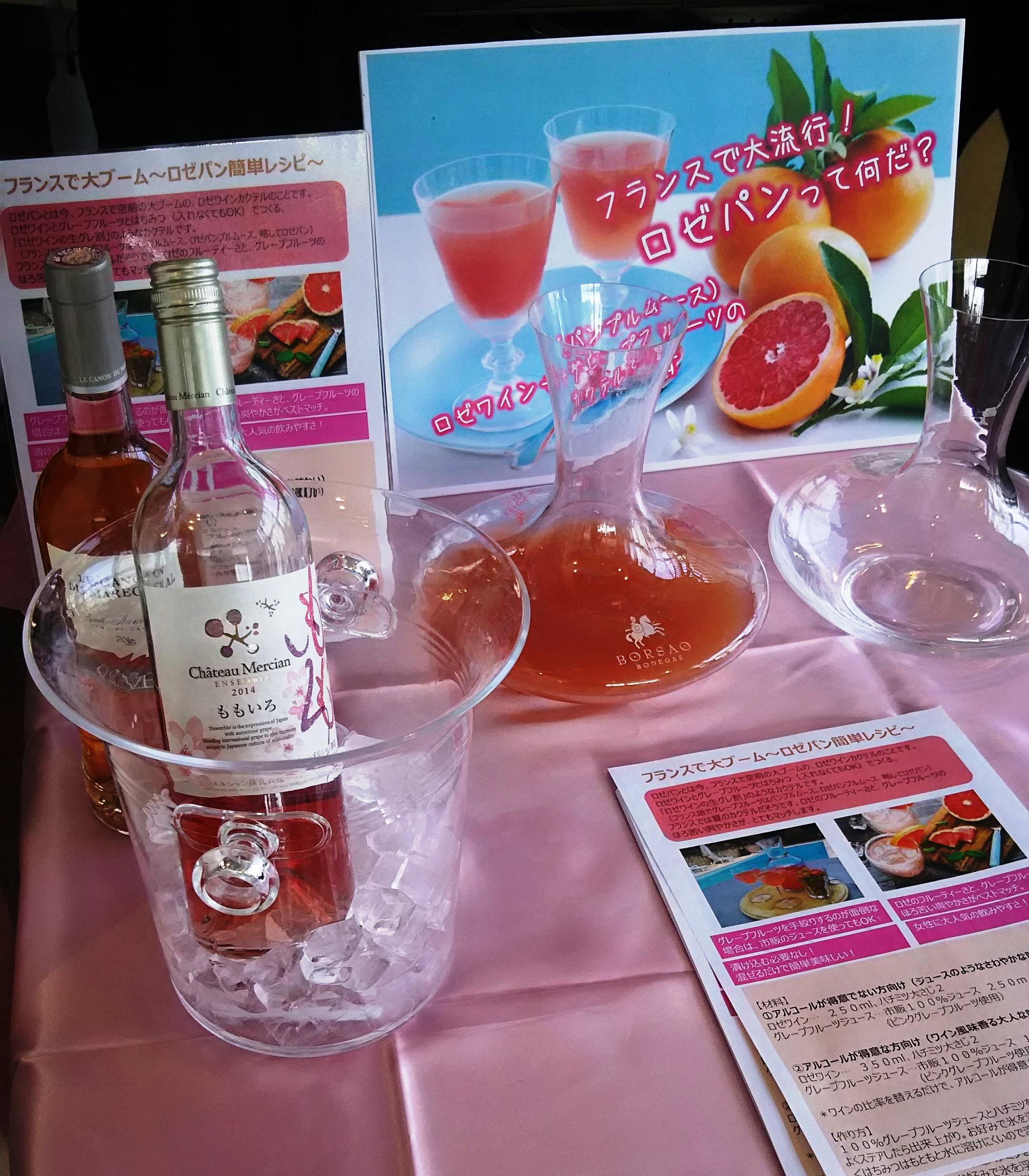 もちろん、すべての商品を味わうことができるのですが、残念ながら今回は香りだけで我慢することにしました(笑)『春のワイン』というテーマ通りに、春にピッタリのピンクのロゼワインがたくさん紹介されていて、中でも一番目についたのが『ロゼパン』というフランスで大ブームのワインカクテルでした。その見た目は、まるでジュース!思わず手に取りそうになりましたよ~