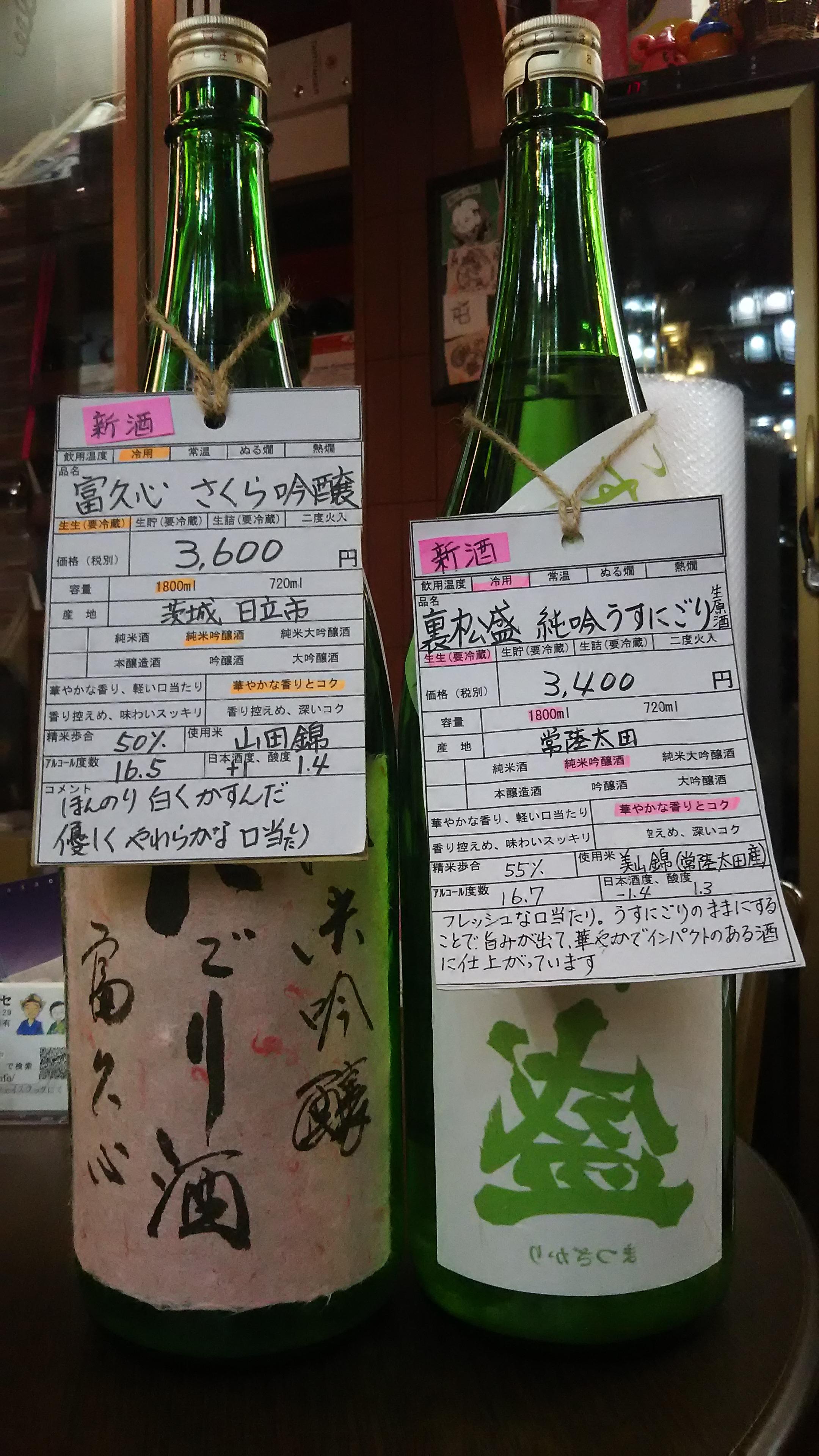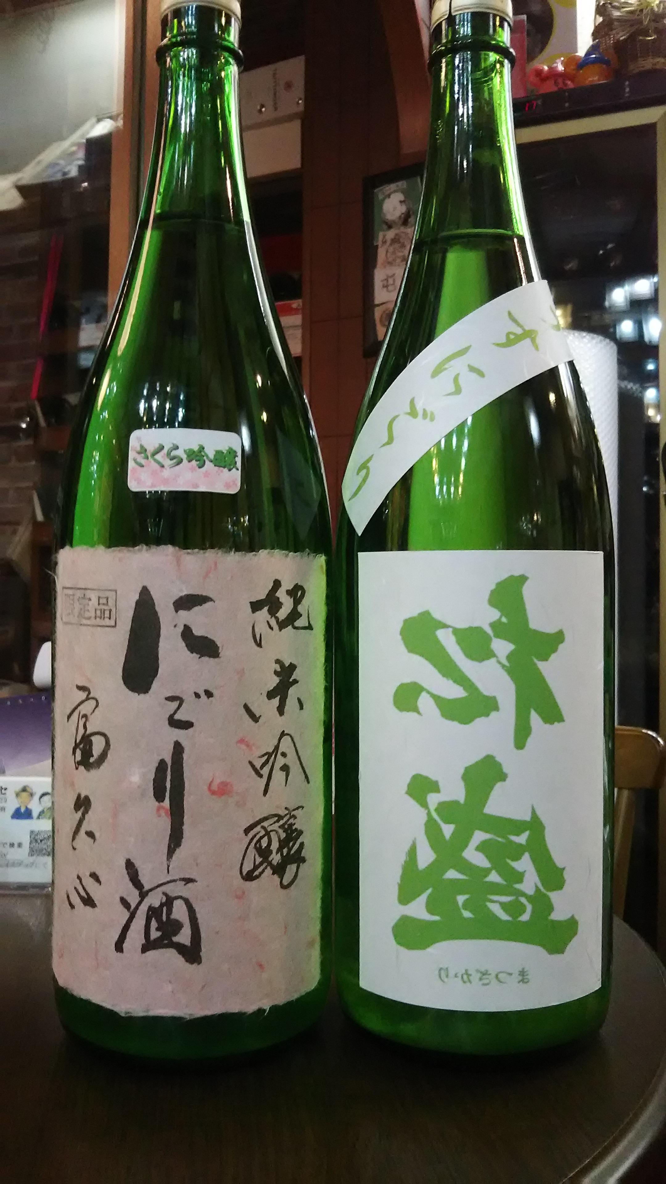 茨城県十王の椎名酒造さんが造る『富久心・さくら吟醸』は、桜の花の時期に味わっていただきたいと言う蔵元の思いから名づけられました。山田錦を50%まで磨いて醸した純米吟醸の原酒で、華やかな香りを漂わせ、力強いコクとうま味を感じることができます。時間の経過とともに、芳醇な甘みと旨味が湧き出してくるので、時間をかけてゆっくりと味わって下さい。つぎに、常陸太田の岡部酒造さんが造る『裏松盛・うすにごり』は、地元産の美山錦を使った純米吟醸の原酒です。まさにいまが、絶好調の美味しさで、この時期を逃してしまったら、一生後悔してしまうくらいに香りと味わいのバランスが抜群に良くなっています。口の中に広がる爽やかな甘みは、完熟したリンゴを食べた時のようで、それでいて後口はさらりとしています。