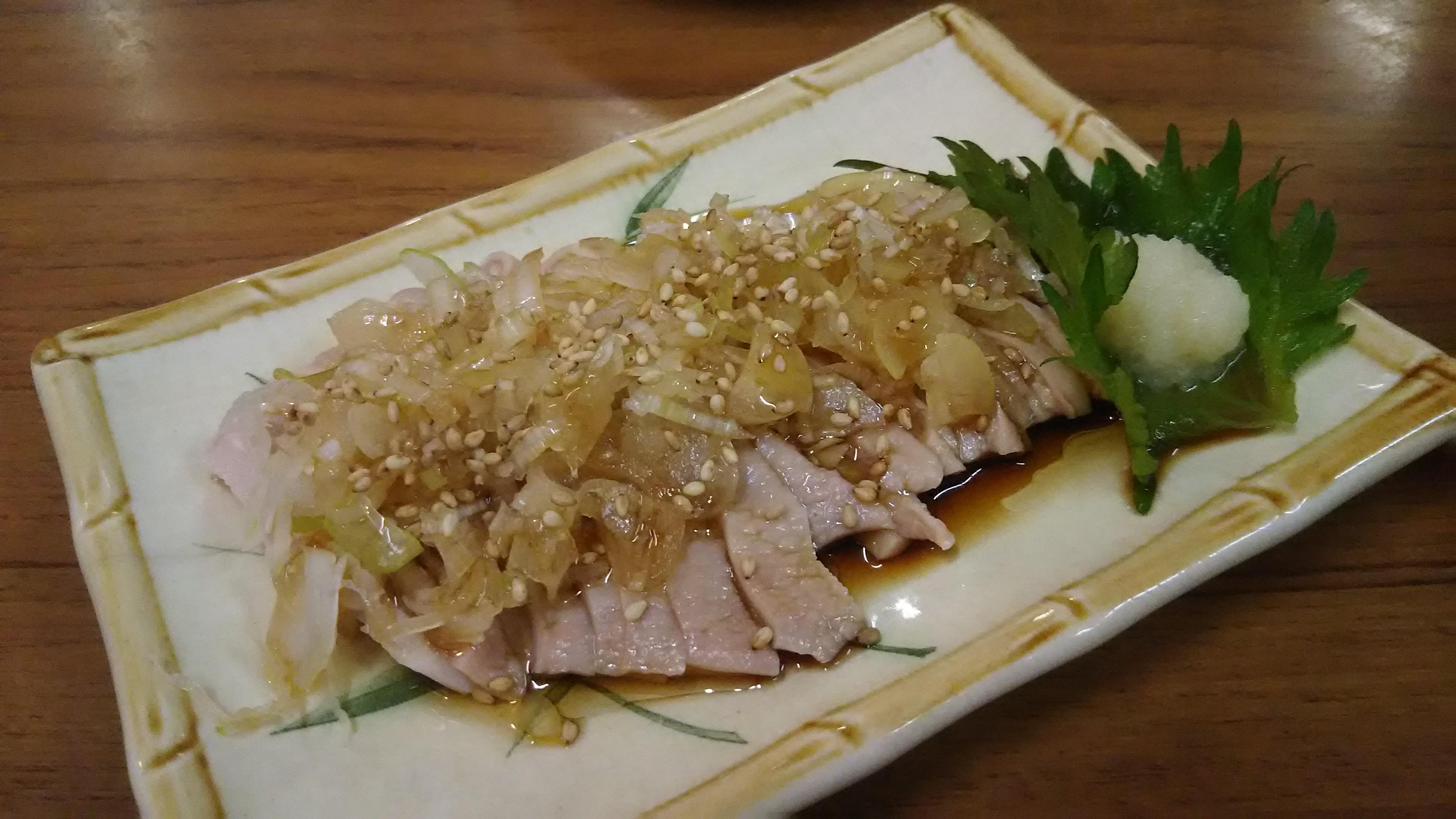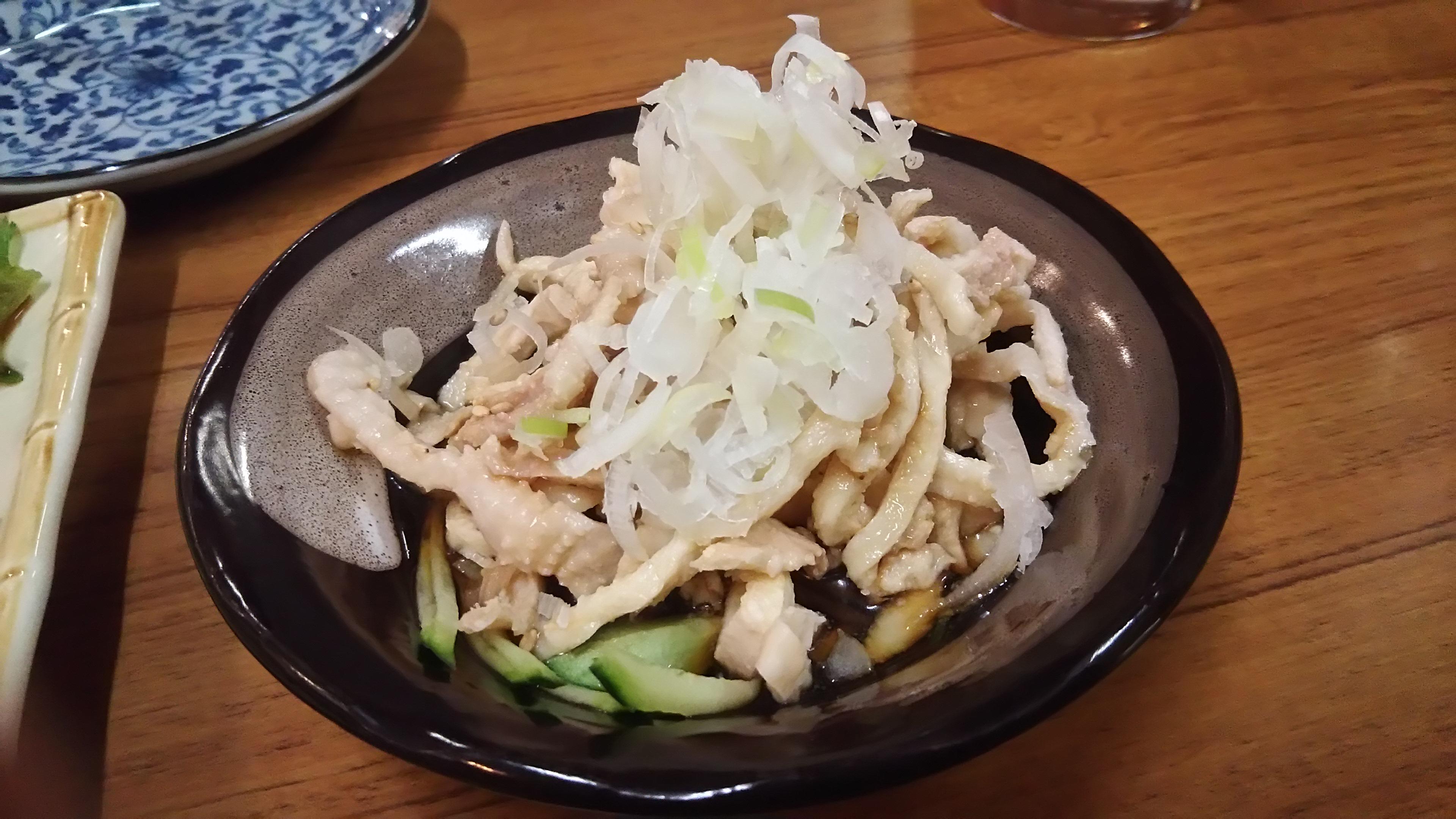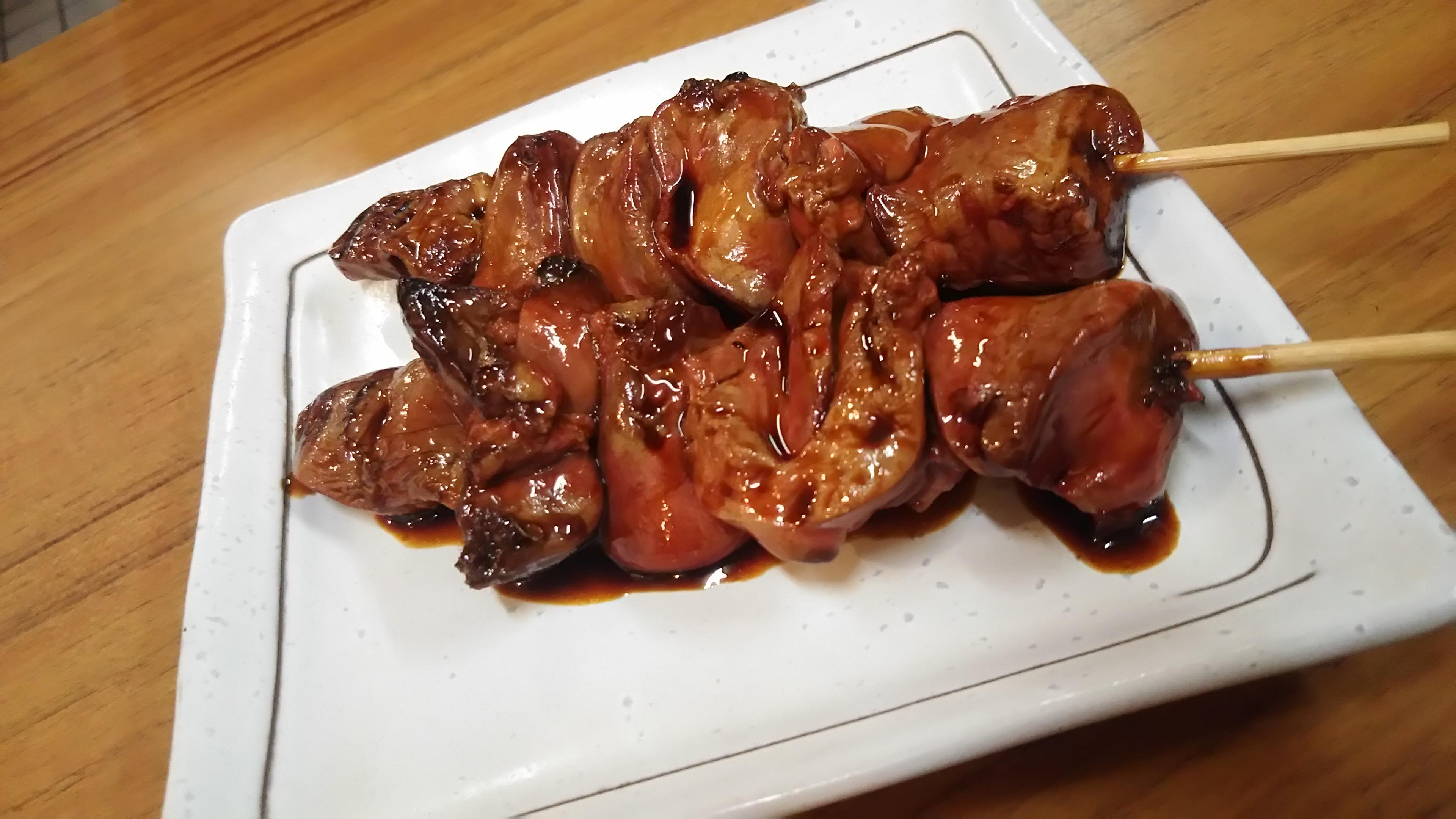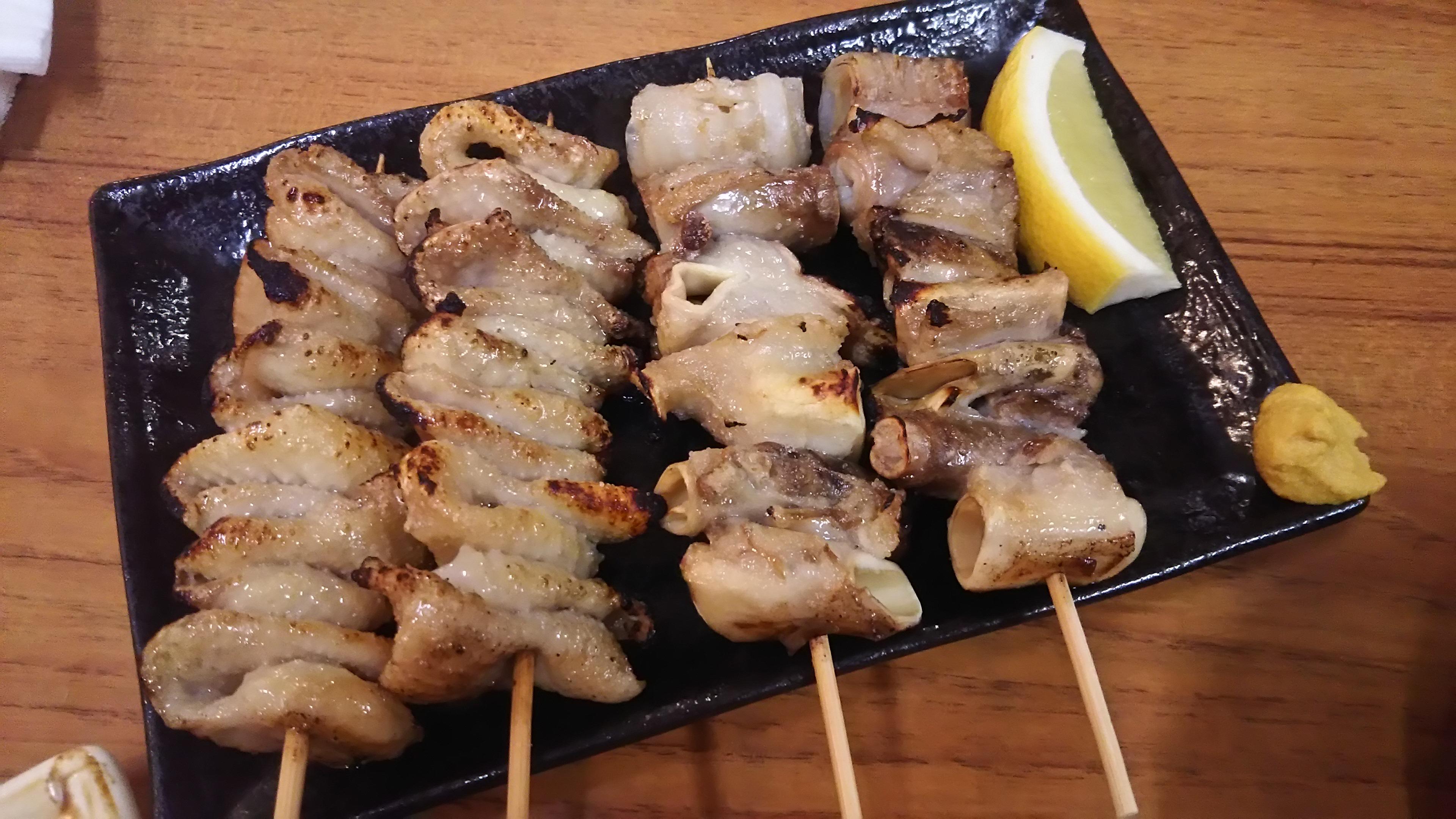 そして、その日のお勧め品の『とり皮ポン酢』と『ガツ(豚の胃袋)刺し』が運ばれてきました。一口食べただけで、鮮度の良さが感じられます!続いて、お店の看板である焼き鳥を色々と注文しました。とろけるような柔らかさの『皮焼き』、ふっくらとした食感の『レバー』等を堪能し、一品料理からは『手羽先餃子』と、王道の『ポテトサラダ』を頂きました。