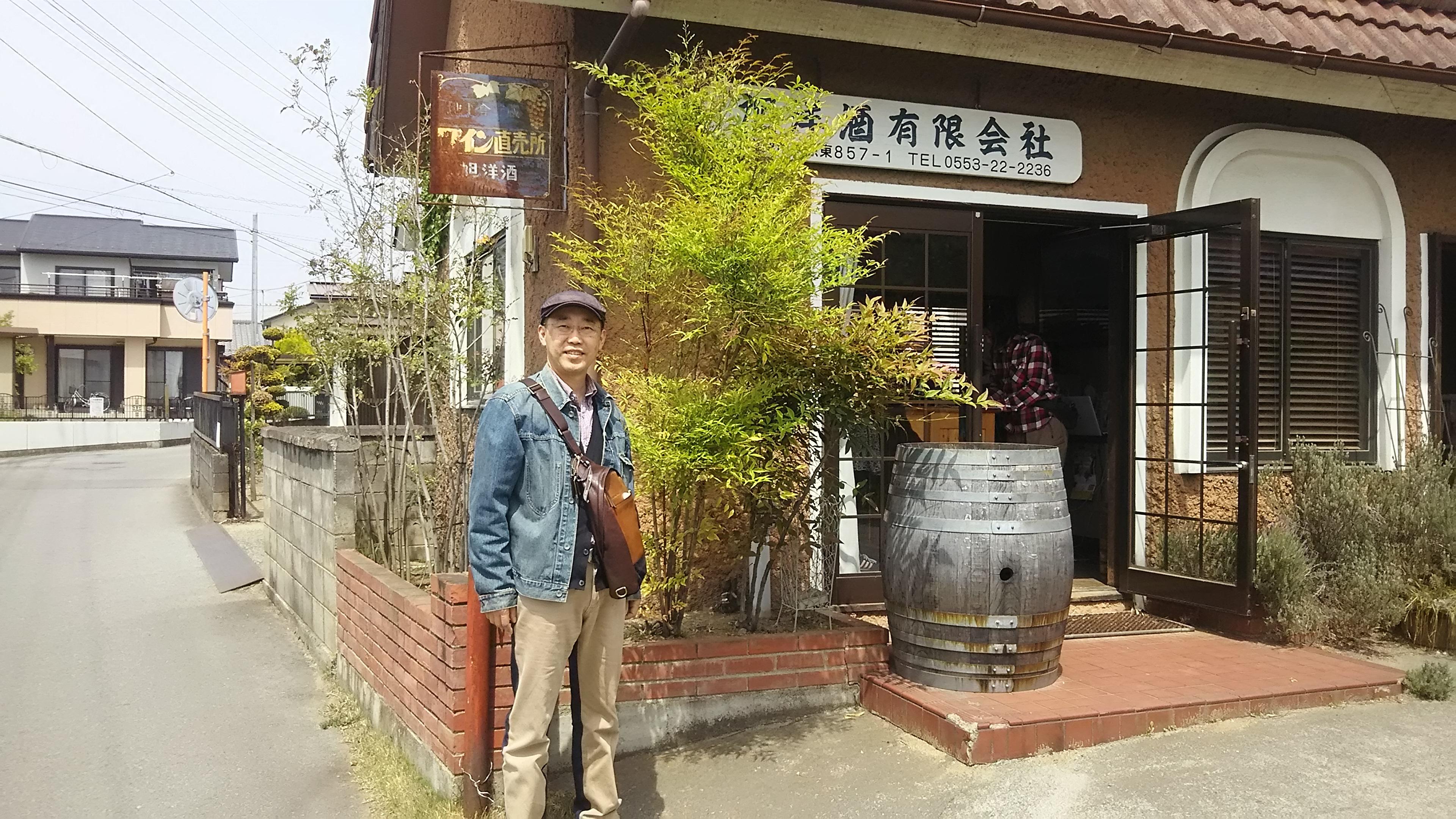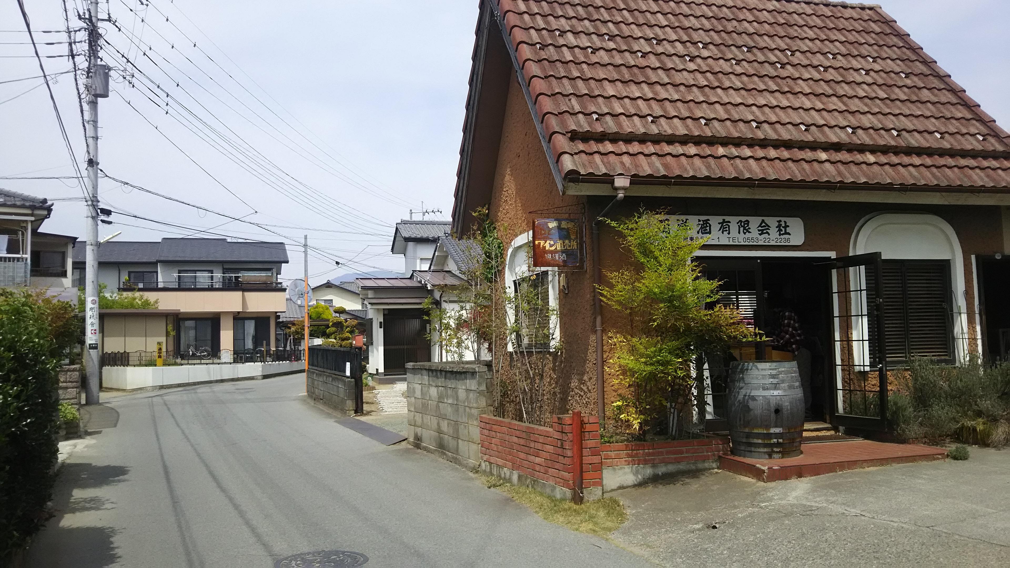 今回の勝沼ぶどう郷ワイナリー巡り、最初の訪問先は、今年の春から新しくお付き合いが始まった、旭洋酒有限会社様で、『ソレイユ』と言う銘柄のワインを造っています。こちらのワイナリーは、勝沼のお隣、山梨市にあり、中央線の東山梨駅から徒歩で15分位の閑静な住宅地の中にあります。パンフレットの写真で見たワイナリーの建物が目に飛び込んできたので、すぐに、ここだと分かりましたが、まさか、こんな住宅地の中だったとは意外でした!