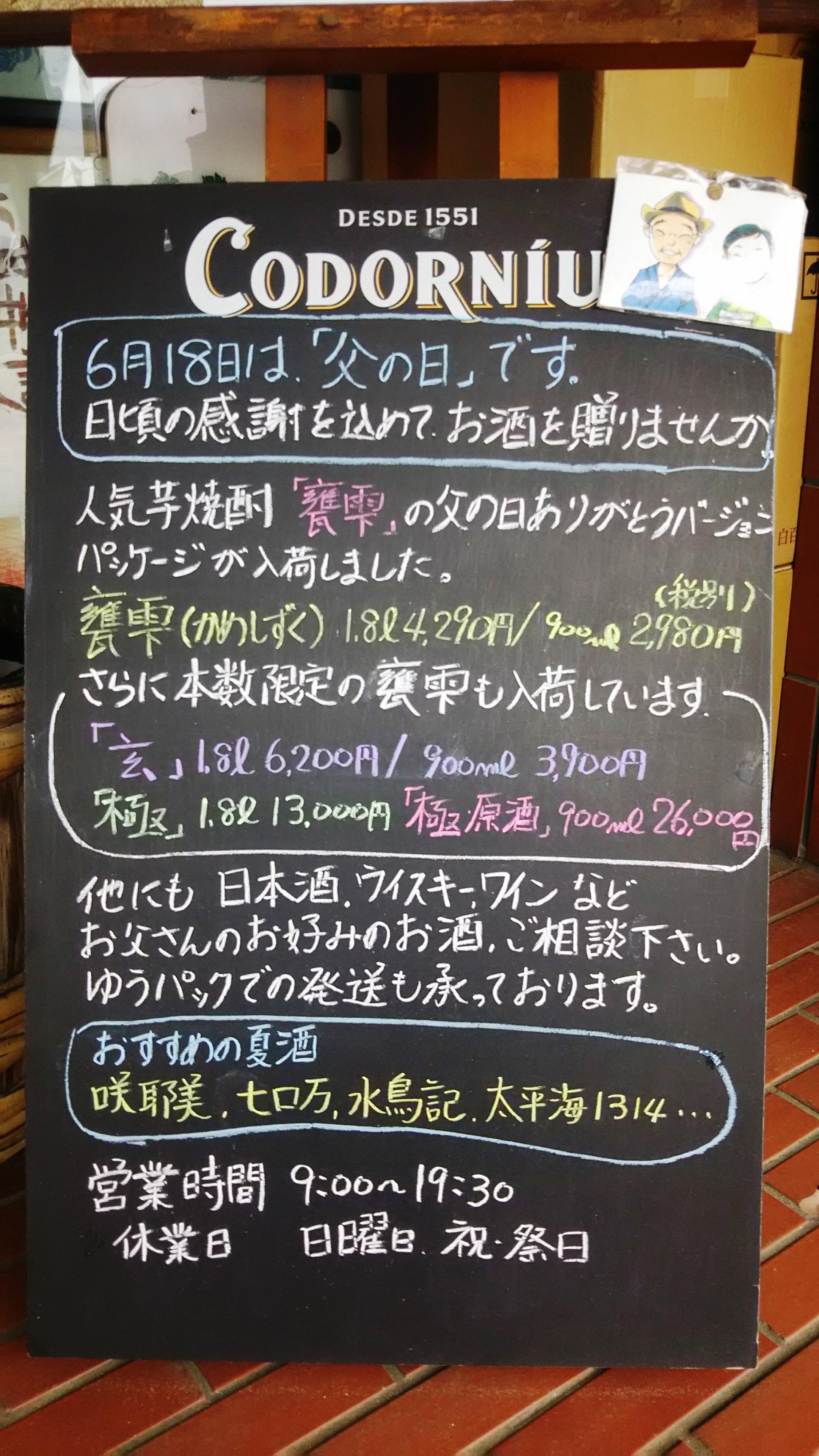6月18日の『父の日』まであと10日となった今日、店頭に置いてある『ウエルカムボード』という名の黒板を書き直すことにしました!とは言っても、この黒板を書いてのは、他でもないみどりさんで、私はというと、ただ脇で見ているだけ・・・、いやいや、そんなことはありません!