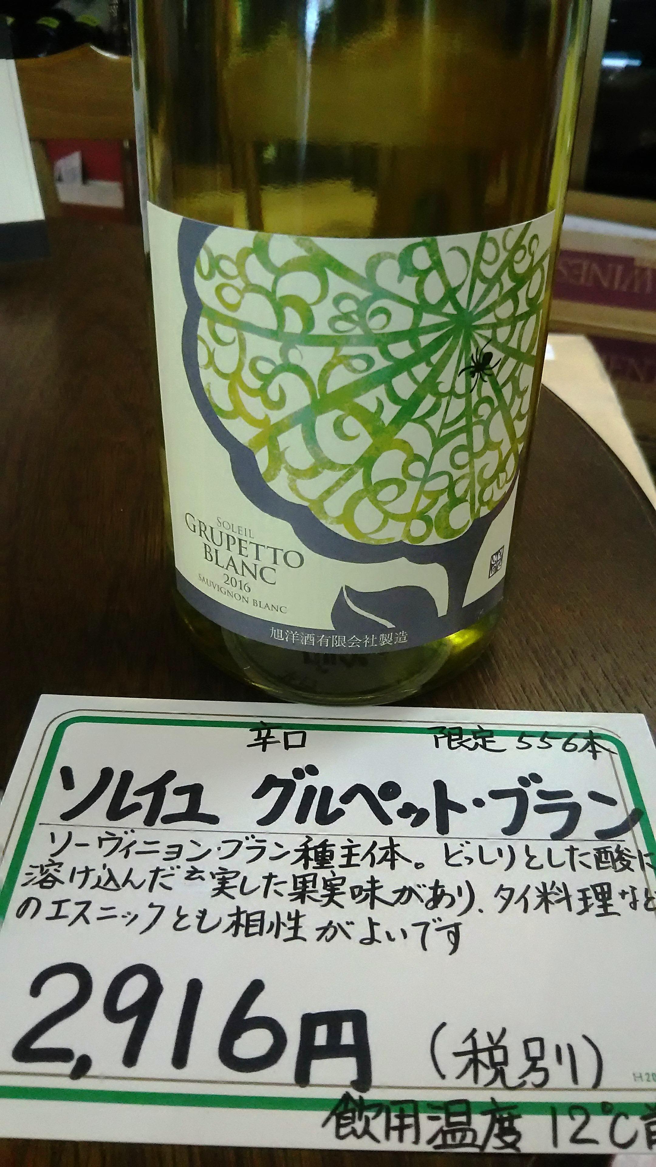 今日は、山梨県で『ソレイユ』を造っている旭洋酒さんから待望のワインが届いたので、早速味わってみることにしました!今回到着したのは『ソレイユ千野甲州・ノンバリック』と『ソレイユ・グルペット・ブラン』の2016年、どちらも最新ヴィンテージです。この『グルペット・ブラン』は、国産の『ソーヴィニヨン・ブラン』を主体に造られています。無類のソーヴィニヨン・ブラン好きの私にとっては、非常に気になる存在で、先月、蔵元様からご案内を頂いてから、届くのを首を長くして待っていました。