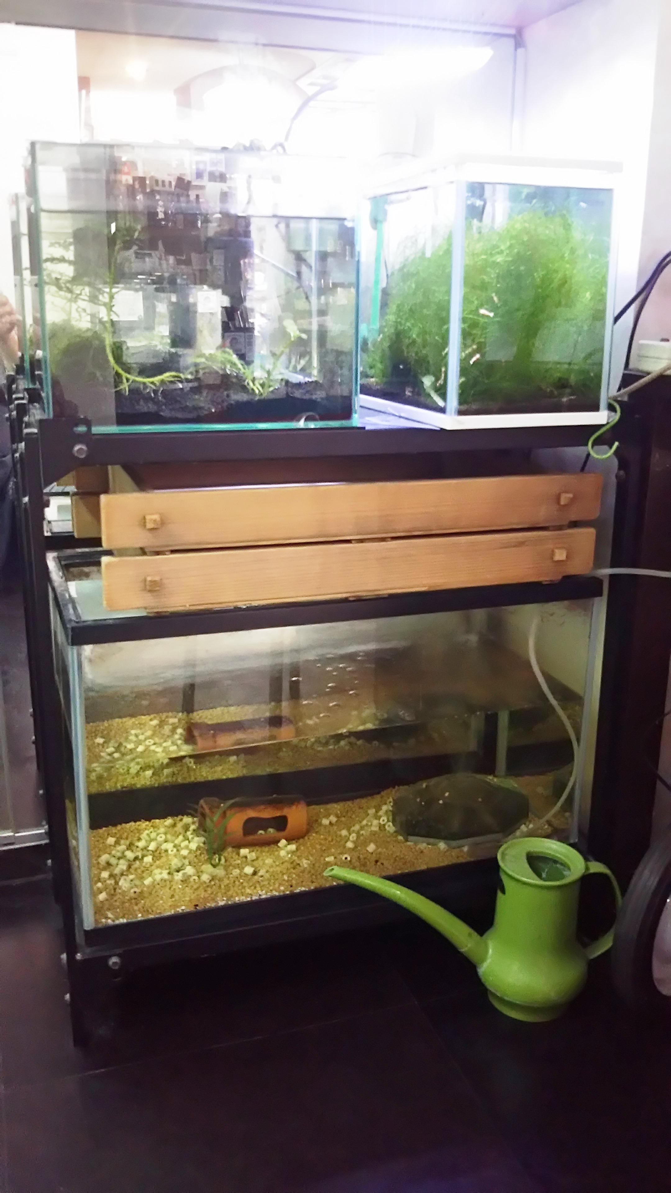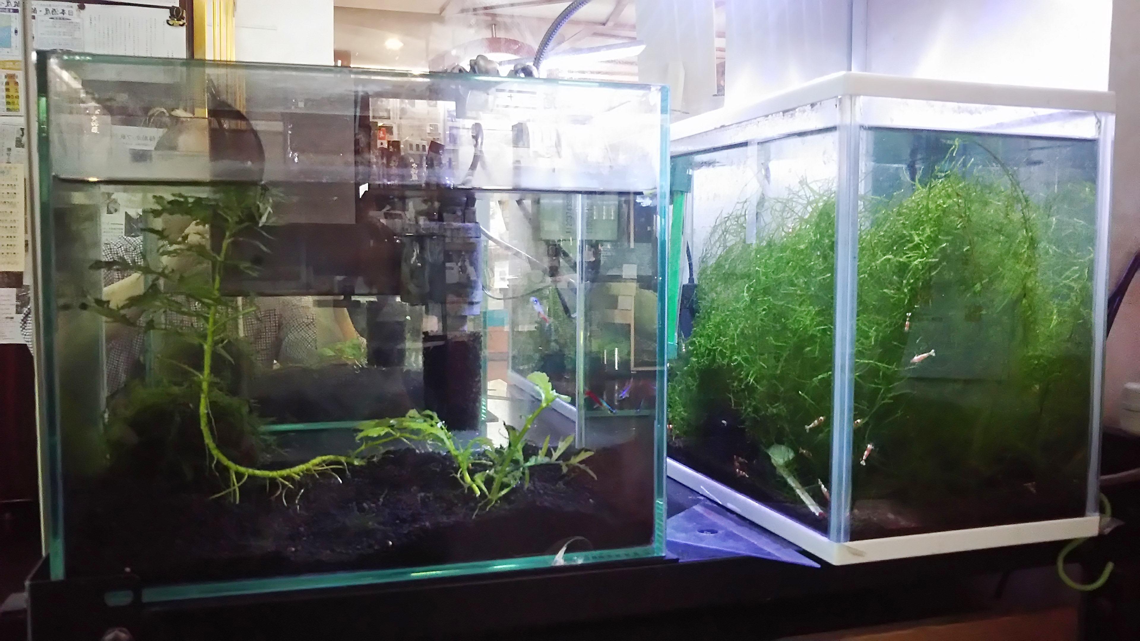 まず初めに、目を引くのが店頭のメダカの樽と店内の『水槽』です。店頭のメダカは冬場は水底にじっとしていて、あまり姿が見えないのですが、水温が上がってきた今は、活動が活発になって水面で元気に泳いでいる姿が見られます。その為、御来店される方は皆さん、樽の中を覗き込んでから店の中に入ってこられます。また店内には『ネオンテトラ』と『レッドビー・シュリンプ』、そして『フナ&ドジョウ』の三つの水槽が置かれています。どれも私が自分自身で購入したものではなく、縁あって当店にやってきたもの達ばかりなのですが、世話をしているうちに情も移って、可愛いな~と思っています。