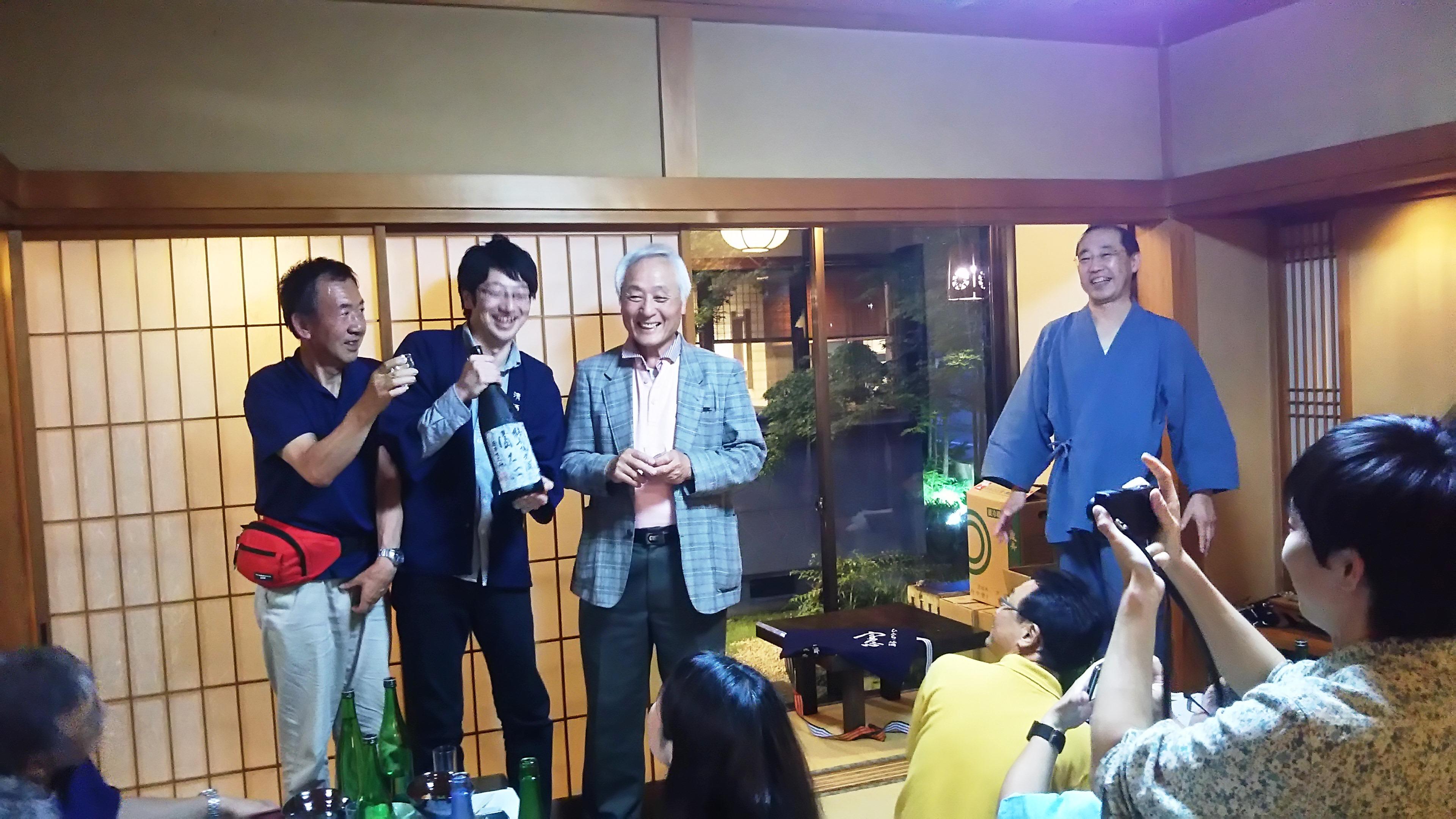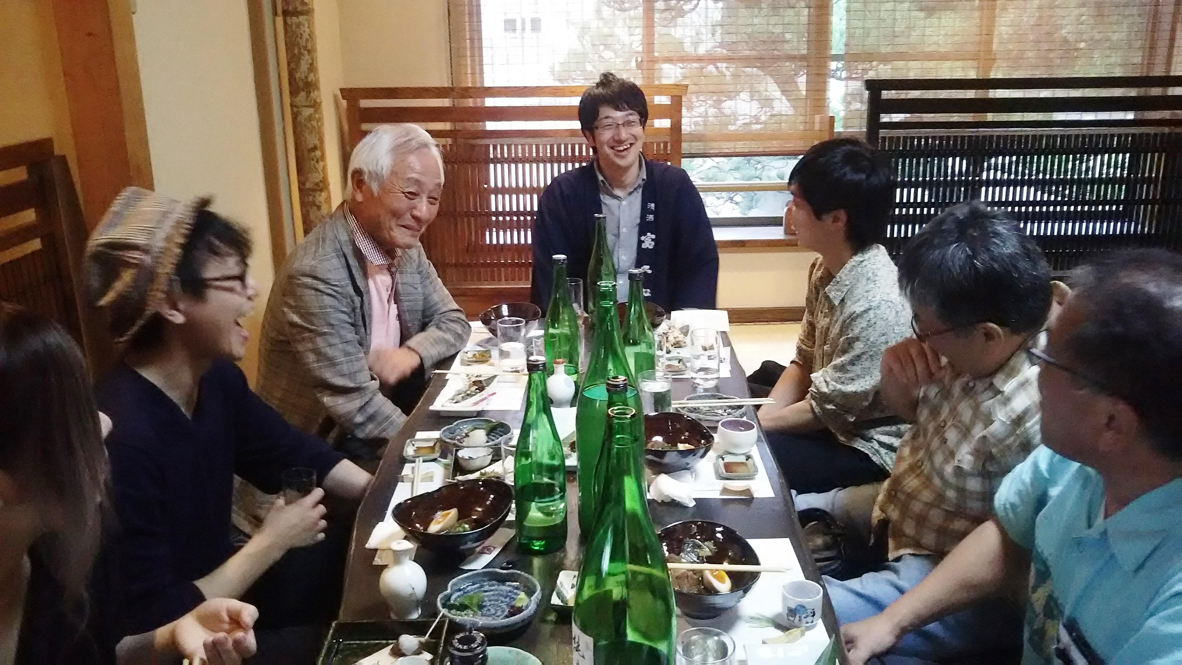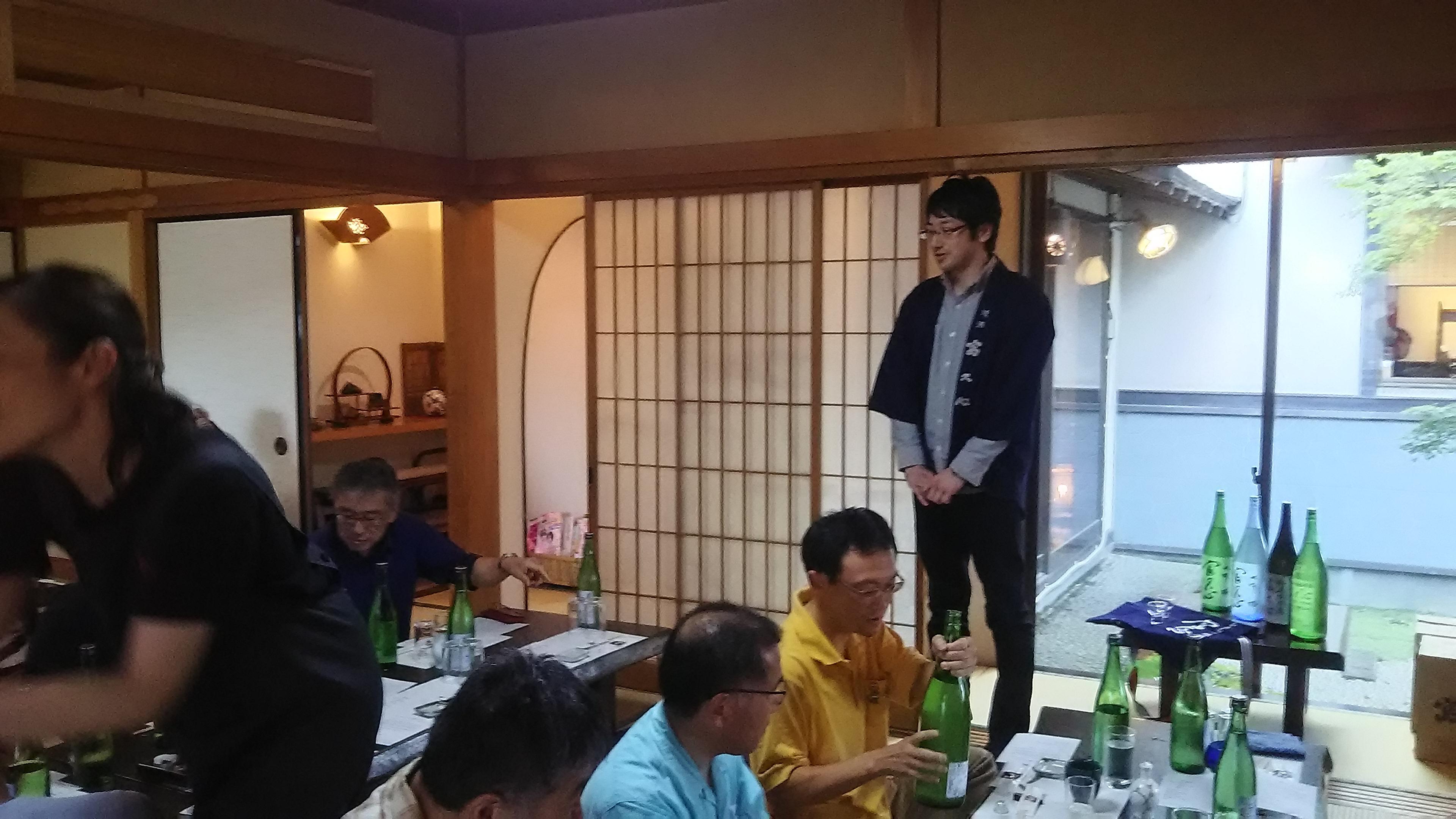 初めのうちはぎこちなかった蔵元も、皆さんの嬉しそうな笑顔に緊張がほぐれ、皆さんの席をまわってお酒の説明をしている姿がとても楽しそうに見えました。途中、記念撮影や慣れないことにも気持ち良く対応してくださって、皆さんも大喜びでした。椎名さんは34歳ととてもお若いのですが、酒造りの全ての工程を一人で担っておられます。最初に椎名さんにお会いしたのは、約6年前だったと思います。当時はまだ20代で、口数の少ない若者という印象でしたが、今では蔵を背負って立つ立派な杜氏に成長され、逞しささえ感じ、私としてもとても嬉しく思っています。