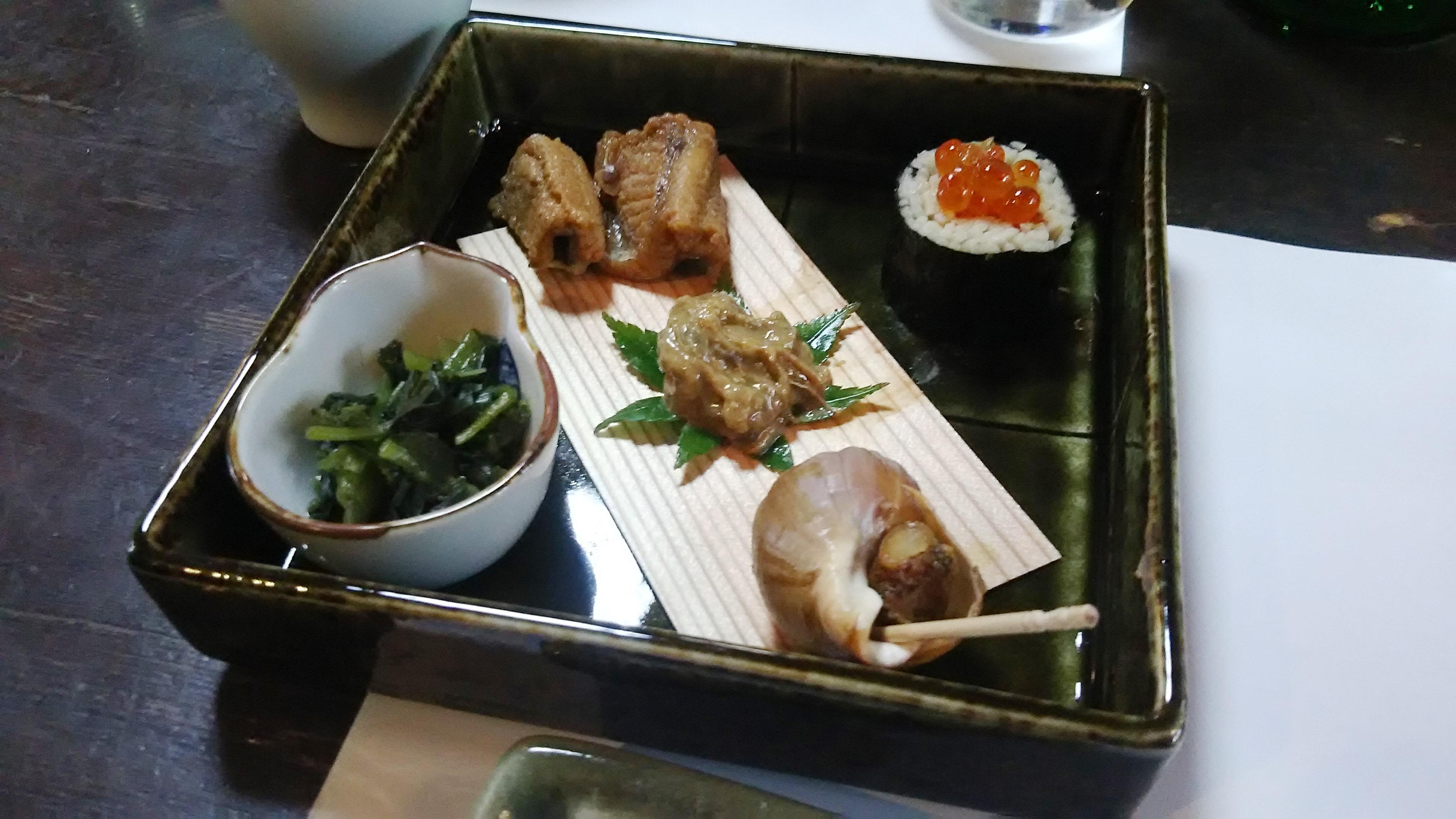 今回のみかわさんのお料理は季節感や様々な味わいのバリエーションに富んだ素晴らしい逸品がテーブル狭しと並べられ、皆様の目と舌を楽しませてくれました。前菜五種盛りは、酒飲みのツボを心得た一皿で、ヒラメの刺身や蒸し料理が脇を固めてくれます。人気料理の鮎の炭火焼きは骨まで軟らかく、蕎麦屋ならではの鴨の角煮は出汁がしみ込んでいてとても美味しかったです。旬のてんぷらには、鱧とししとうが季節感を演出していました!