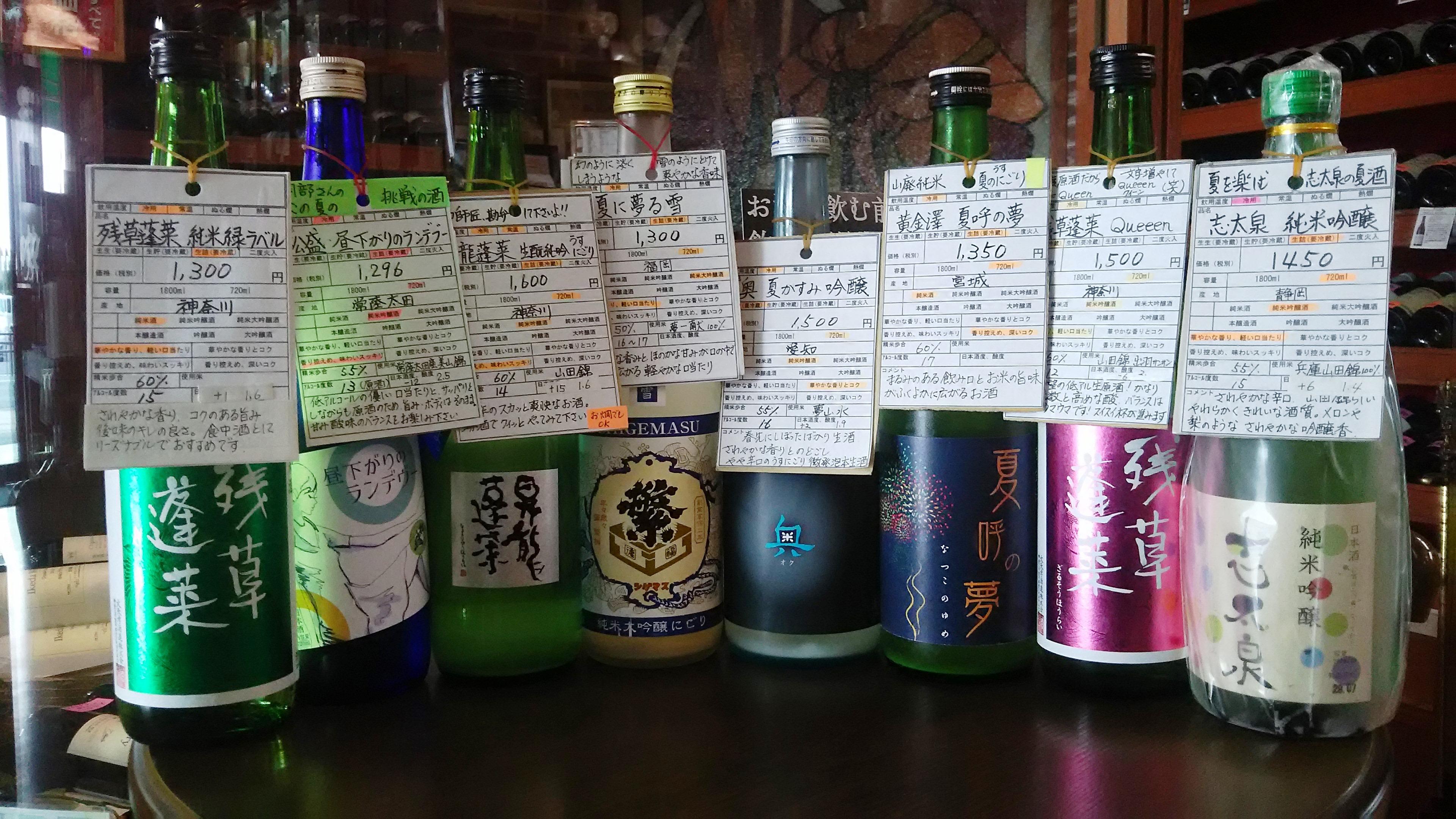 昼間の暑さが和らいだ夕暮、火照った身体を癒してくれるのが『夏のうすにごり』ですね~。シュワっとしたものや、まったりコッテリとした味わいの物など、バリエーションに富んでいるのも魅力の一つです!微発泡の清涼感が楽しめる『奥・夏かすみ吟醸』、しっかりとした旨味が感じられる『黄金澤・夏呼の夢』、ふわりとした滑らかな舌触りの『繁桝・夏に夢る雪』、そして甘辛料理との相性が抜群の『昇龍蓬莱・辛口師匠』等はいかがでしょうか・・・。