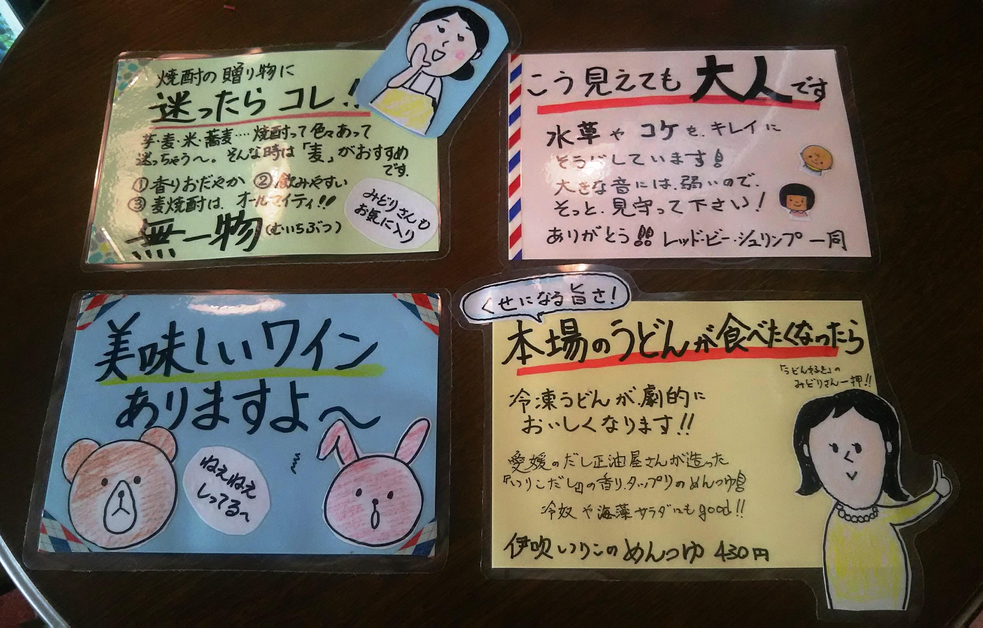 何とか、二人合わせて4枚の『手書きPOP』を作ることができましたが、出来の良し悪しは創り手の気持ちが込められているか大切なんですよ~!との講師の方の言葉に励まされ、よぉ~し!明日から、毎日一枚ずつでも作ってみよう!と、言う気持ちになっています。まずは、やってみることが大切なんですよね。数をこなせば、だんだん上達するかもしれませんしね・・・。目指せ、手書きPOPマスター、その道のりは遠そうですが、御来店の際は、ちょっとだけ注意してみてください(笑)