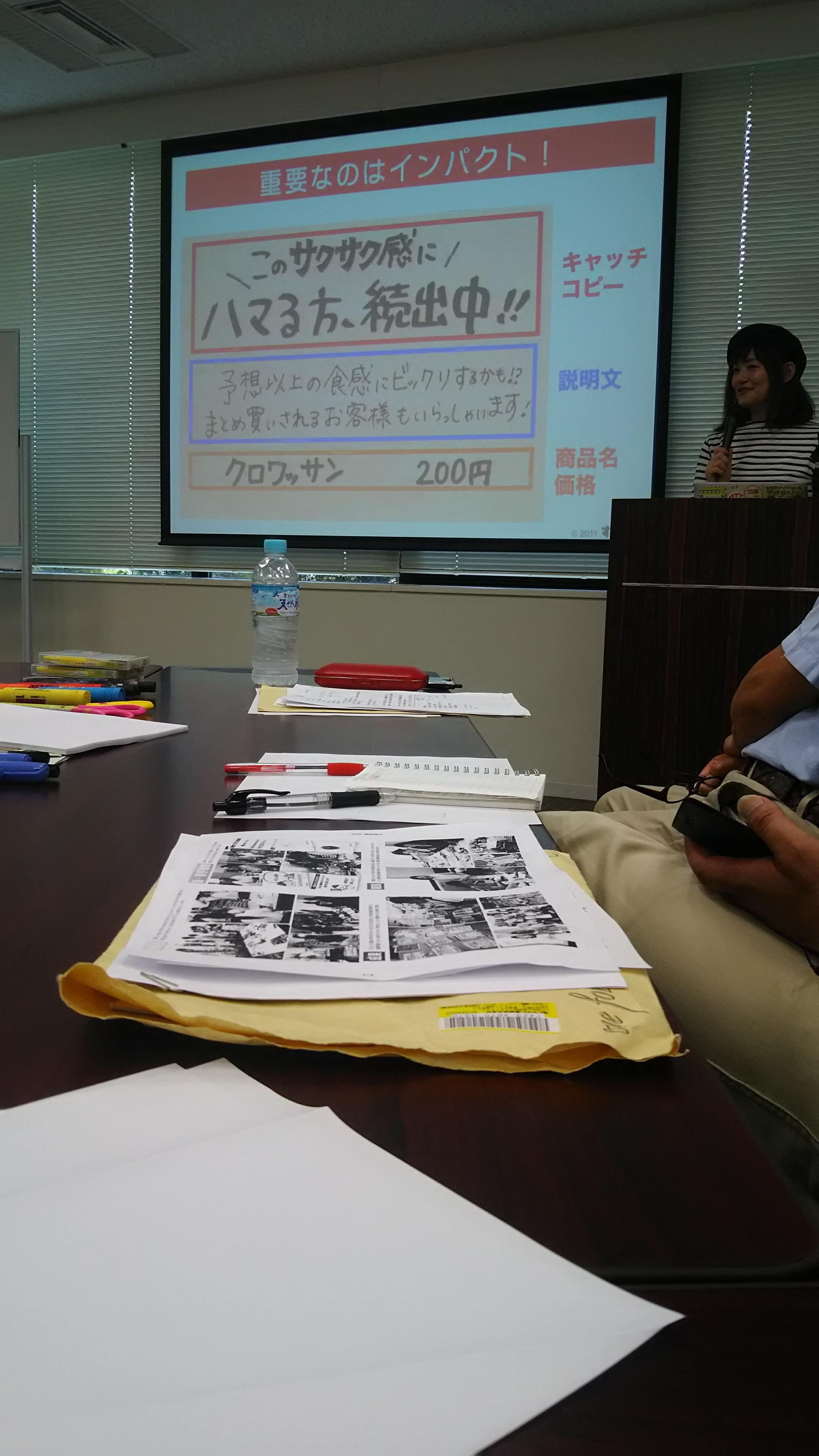 4時間以上のセミナーという事で、最後まで続けられるか心配でしたが、そんな気持ちも最初の30分で何処かへ吹き飛んでしまいました。前半戦は、スライドを使って『手書きPOP』の効果や基本を実例を挙げて丁寧に説明して頂きました。初めて見た時の『1秒間のインパクト』がとても大事なんだそうです!そして、後半戦には実際にイラストを描いてみたり、自分の店でお勧めしたい商品の『手書きPOP』を作ったりとで、あっという間に時間が過ぎてしまいました!