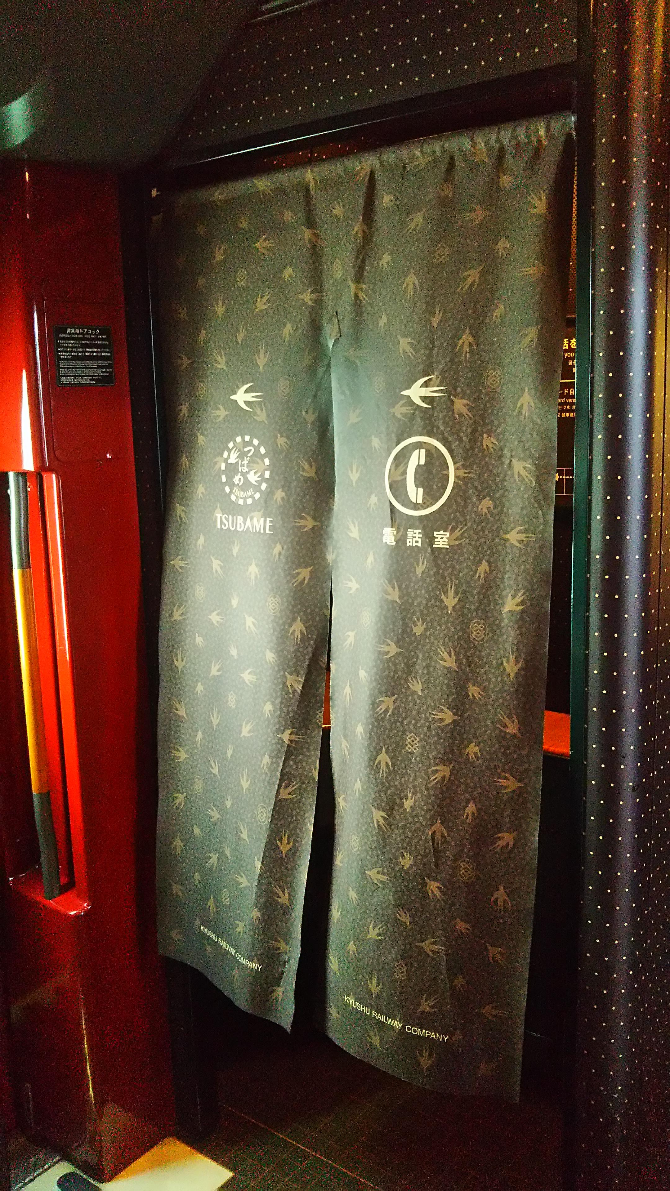 今回は、二種類の車両を乗り継いで行きました。高級ソファのような椅子が印象的の『さくら』では、先頭車両の一番前の席という幸運に恵まれました。続いて乗った『つばめ』は和の印象のお洒落な応接室を感じさせます。デッキにある通話コーナーに掛かっていた暖簾が素敵でした。