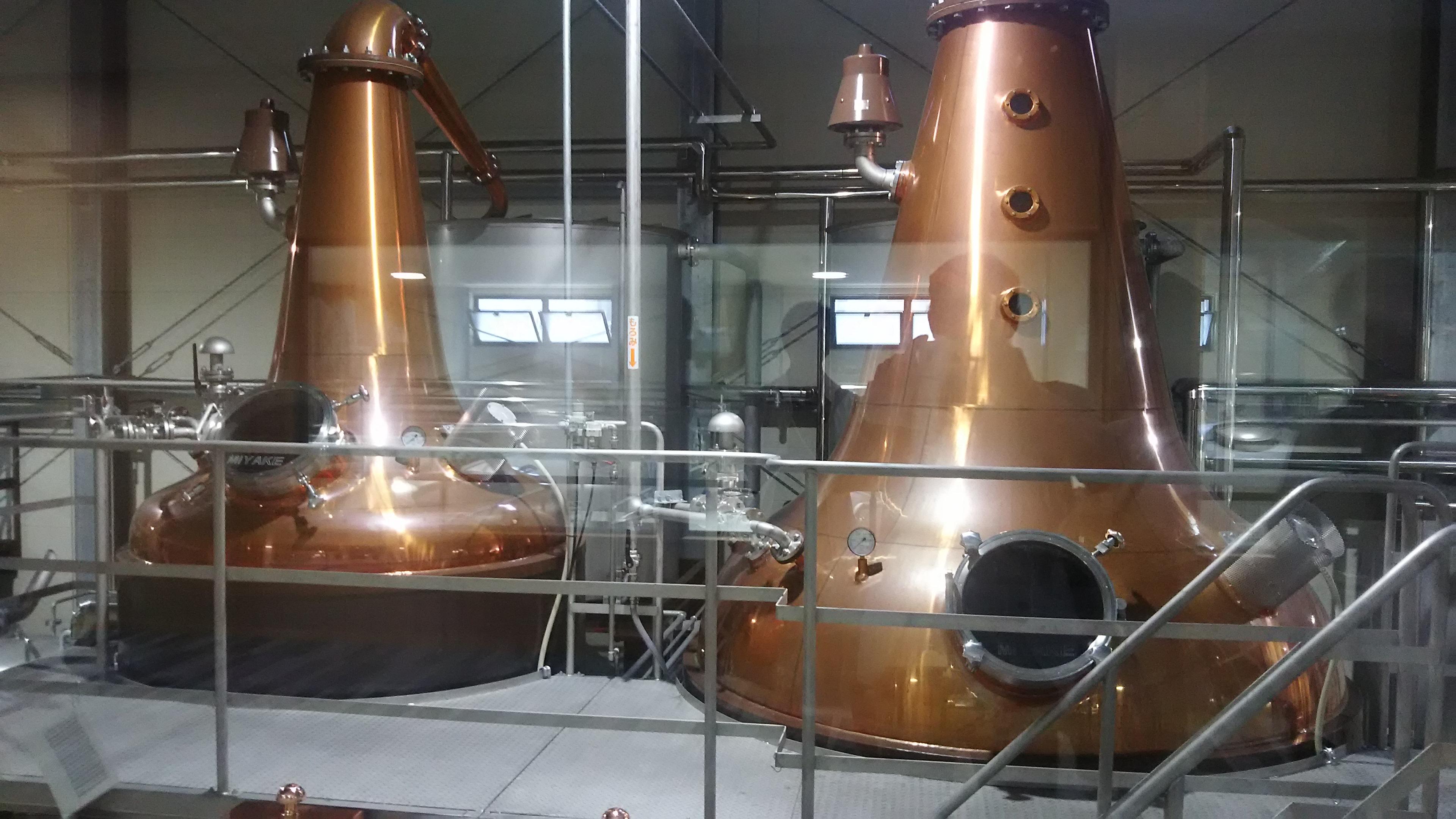 重厚な扉の中には、マルスさんの歴史が一目で分かる資料館となっています。中でも目を引いたのが、見上げるほどの高さの『スーパーアロスパロス蒸留器』。あまりの大きさと高さに、見上げてもてっぺんが見えませんでした。続いて、津貫蒸留所の心臓部『ウイスキー蒸留塔』へ。真新しいポットスティル二基が光り輝いていました!建物内の中二階からは発酵タンクなどが見渡せ、ウイスキー造りのビデオ映像が上映されているので、初めての方でも分かりやすいです。
