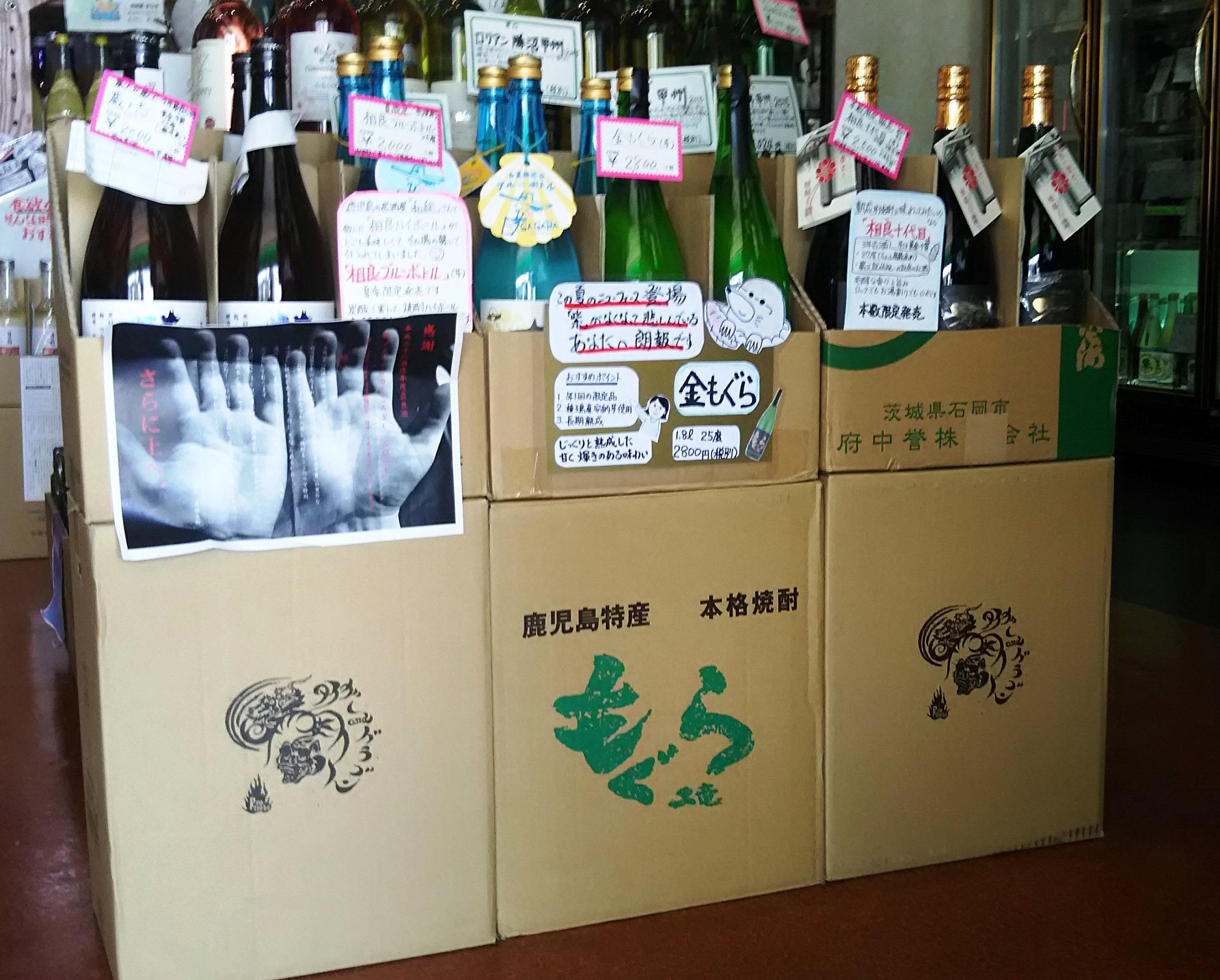 その様な限定品が集中するのが春から夏にかけての時期、ちょうど今なんです!通常、私の店では店内に入って左手の所が本格焼酎コーナーとなっていてますが、通常品と限定品が混在してしまったので、今回は、お客様が選びやすいように、店内の正面に『限定芋焼酎の特設コーナー』を作りました!今の時期のお勧めの物を一か所に並べることで、それぞれの商品を見比べて、選びやすくなったのではないかと思います。