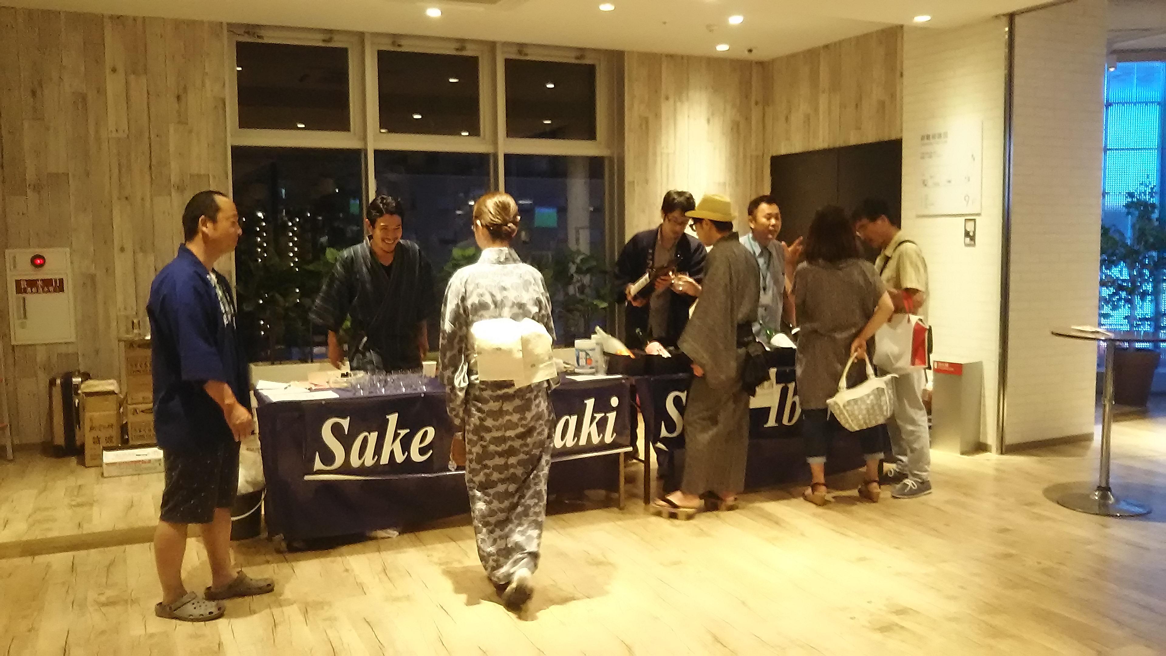 イベント会場は、オーパ9階の飲食店街の一角に設けられ、エレベーターを降りるとすぐに受付と日本酒のコーナーがあり、浴衣姿のスタッフの方が私たちを出迎えてくれました。